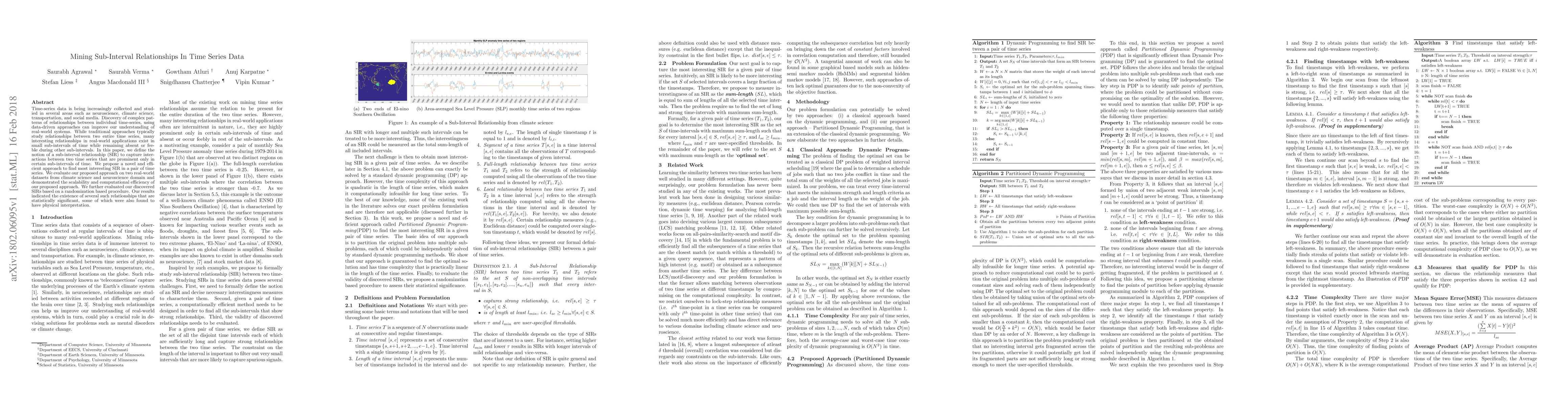 Time-series data is being increasingly collected and stud- ied in several areas such as neuroscience, climate science, transportation, and social media. Discovery of complex patterns of relationships between individual time-series, using data-driven approaches can improve our understanding of real-world systems. While traditional approaches typically study relationships between two entire time series, many interesting relationships in real-world applications exist in small sub-intervals of time while remaining absent or feeble during other sub-intervals. In this paper, we define the notion of a sub-interval relationship (SIR) to capture inter- actions between two time series that are prominent only in certain sub-intervals of time. We propose a novel and efficient approach to find most interesting SIR in a pair of time series. We evaluate our proposed approach on two real-world datasets from climate science and neuroscience domain and demonstrated the scalability and computational efficiency of our proposed approach. We further evaluated our discovered SIRs based on a randomization based procedure. Our results indicated the existence of several such relationships that are statistically significant, some of which were also found to have physical interpretation.