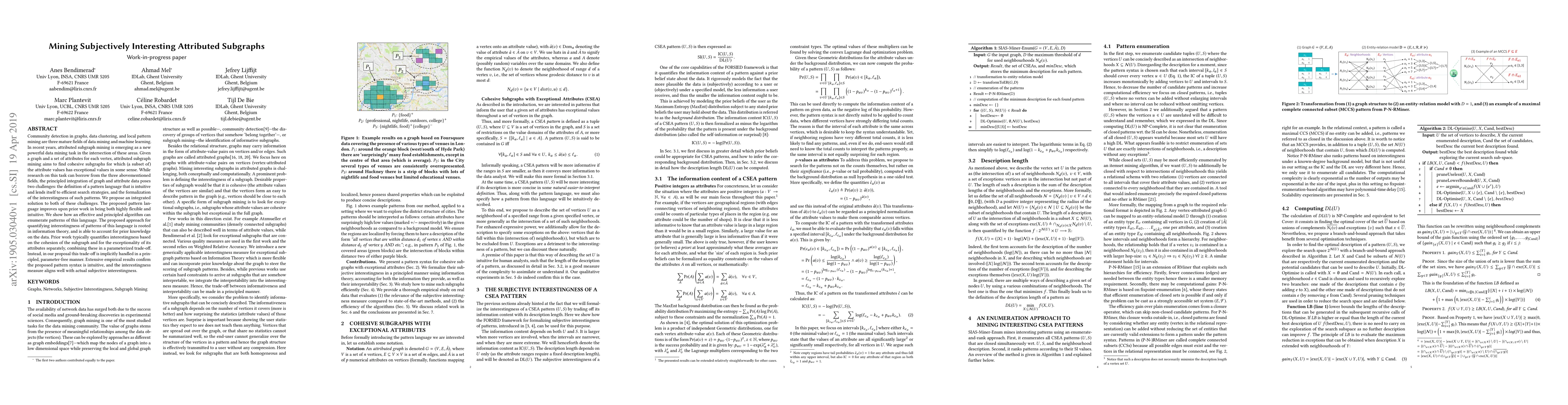 This paper proposes a novel pattern language for mining subjectively interesting attributed subgraphs, integrating graph and attribute data. It introduces an efficient algorithm for pattern enumeration and a principled, parameter-free information theory-based measure for quantifying interestingness that aligns well with subjective assessments, as confirmed by empirical results.