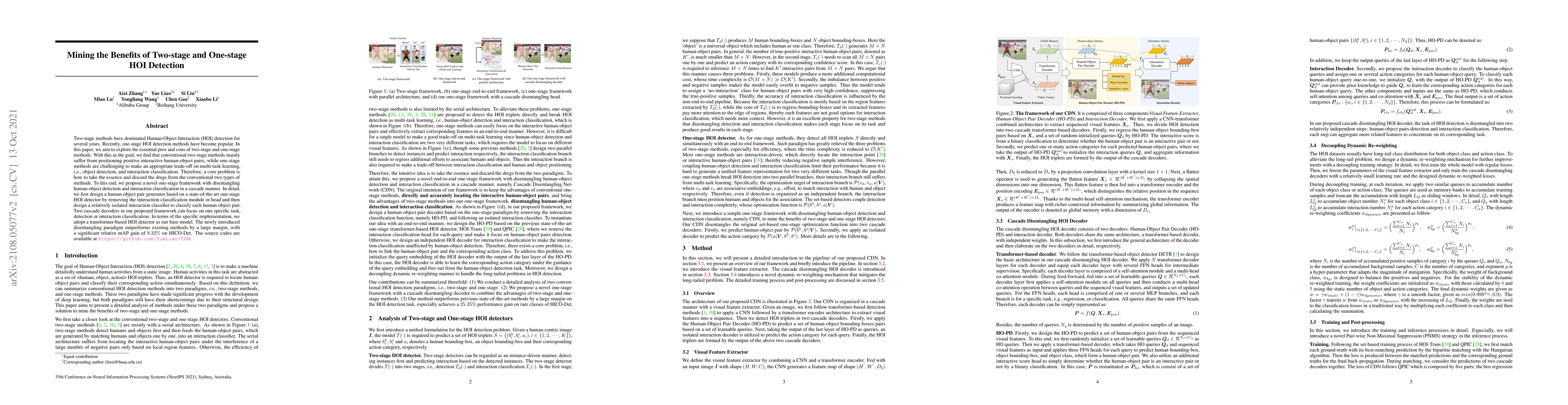 This paper compares two-stage and one-stage methods for Human-Object Interaction detection, highlighting their respective challenges. It proposes a novel one-stage framework that disentangles human-object detection and interaction classification in a cascade manner, achieving a 9.32% relative mAP gain on HICO-Det.