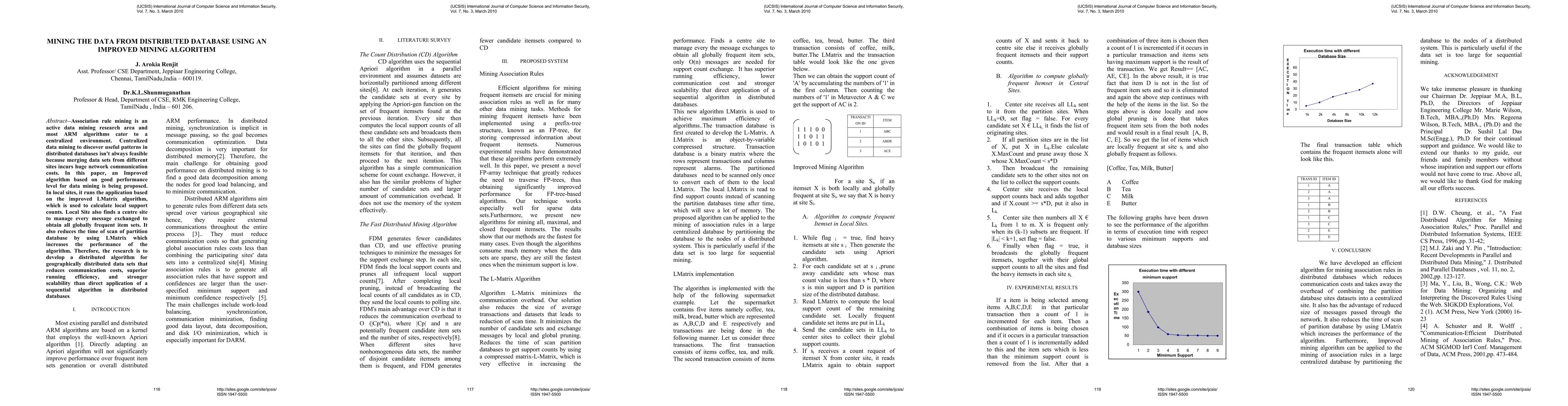 Association rule mining is an active data mining research area and most ARM algorithms cater to a centralized environment. Centralized data mining to discover useful patterns in distributed databases isn't always feasible because merging data sets from different sites incurs huge network communication costs. In this paper, an Improved algorithm based on good performance level for data mining is being proposed. In local sites, it runs the application based on the improved LMatrix algorithm, which is used to calculate local support counts. Local Site also finds a centre site to manage every message exchanged to obtain all globally frequent item sets. It also reduces the time of scan of partition database by using LMatrix which increases the performance of the algorithm. Therefore, the research is to develop a distributed algorithm for geographically distributed data sets that reduces communication costs, superior running efficiency, and stronger scalability than direct application of a sequential algorithm in distributed databases.
