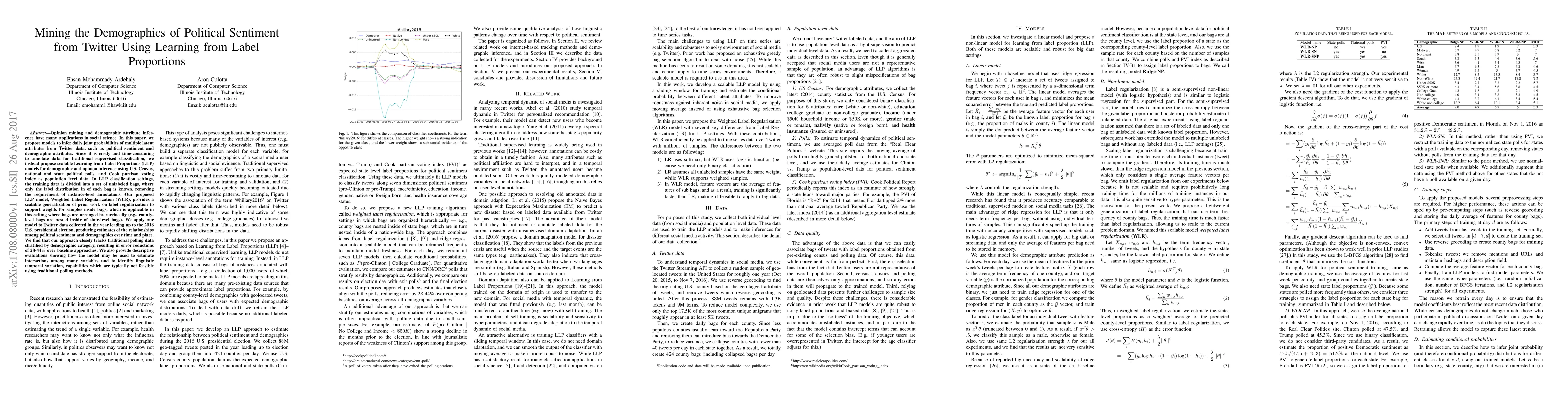 Opinion mining and demographic attribute inference have many applications in social science. In this paper, we propose models to infer daily joint probabilities of multiple latent attributes from Twitter data, such as political sentiment and demographic attributes. Since it is costly and time-consuming to annotate data for traditional supervised classification, we instead propose scalable Learning from Label Proportions (LLP) models for demographic and opinion inference using U.S. Census, national and state political polls, and Cook partisan voting index as population level data. In LLP classification settings, the training data is divided into a set of unlabeled bags, where only the label distribution in of each bag is known, removing the requirement of instance-level annotations. Our proposed LLP model, Weighted Label Regularization (WLR), provides a scalable generalization of prior work on label regularization to support weights for samples inside bags, which is applicable in this setting where bags are arranged hierarchically (e.g., county-level bags are nested inside of state-level bags). We apply our model to Twitter data collected in the year leading up to the 2016 U.S. presidential election, producing estimates of the relationships among political sentiment and demographics over time and place. We find that our approach closely tracks traditional polling data stratified by demographic category, resulting in error reductions of 28-44% over baseline approaches. We also provide descriptive evaluations showing how the model may be used to estimate interactions among many variables and to identify linguistic temporal variation, capabilities which are typically not feasible using traditional polling methods.