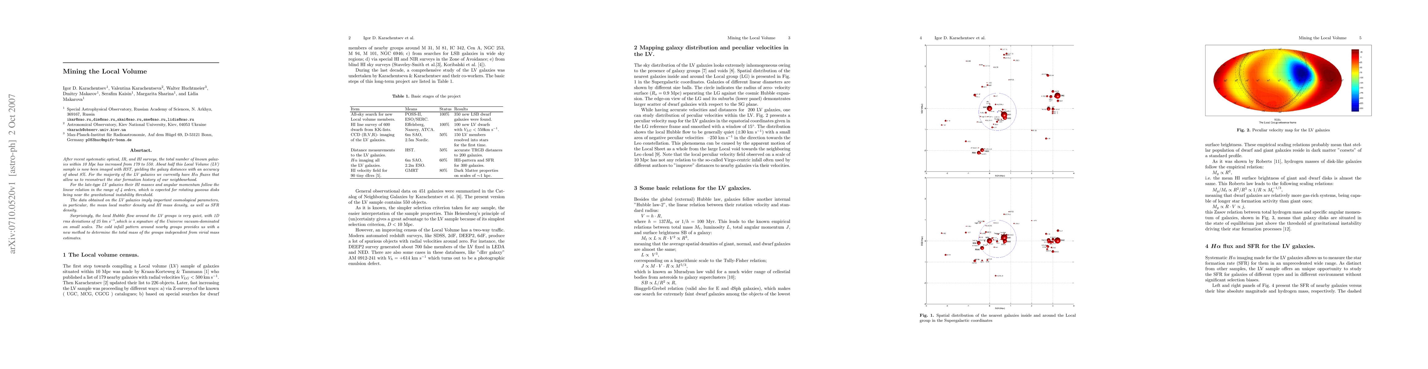 After recent systematic optical, IR, and HI surveys, the total number of known galaxies within 10 Mpc has increased from 179 to 550. About half this Local Volume (LV) sample is now been imaged with HST, yielding the galaxy distances with an accuracy of about 8%. For the majority of the LV galaxies we currently have H-alpha fluxes that allow us to reconstruct the star formation history of our neighbourhood. For the late-type LV galaxies their HI masses and angular momentum follow the linear relation in the range of 4 orders, which is expected for rotating gaseous disks being near the gravitational instability threshold. The data obtained on the LV galaxies imply important cosmological parameters, in particular, the mean local matter density and HI mass density, as well as SFR density. Surprisingly, the local Hubble flow around the LV groups is very quiet, with 1D rms deviations of 25 km/s,which is a signature of the Universe vacuum-dominated on small scales. The cold infall pattern around nearby groups provides us with a new method to determine the total mass of the groups independent from virial mass estimates.