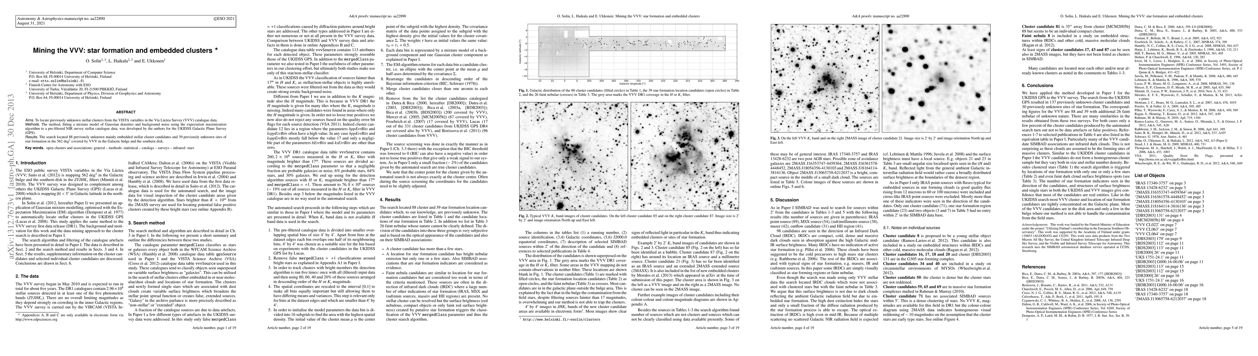The aim of this study is to locate previously unknown stellar clusters from the VISTA variables in the V\'ia L\'actea Survey (VVV) catalogue data. The method, fitting a mixture model of Gaussian densities and background noise using the expectation maximization algorithm to a pre-filtered NIR survey stellar catalogue data, was developed by the authors for the UKIDSS Galactic Plane Survey (GPS). The search located 88 previously unknown mainly embedded stellar cluster candidates and 39 previously unknown sites of star formation in the 562 deg2 covered by VVV in the Galactic bulge and the southern disk.