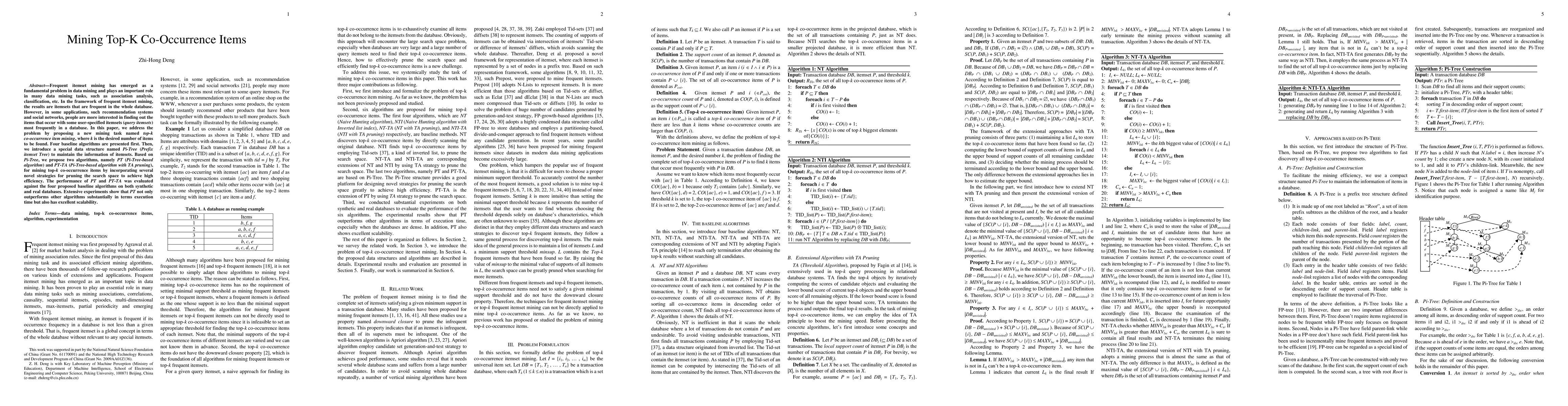 This paper introduces a new mining task for identifying top-k co-occurrence items in databases, focusing on items frequently associated with user-specified query itemsets. It proposes two efficient algorithms, PT and PT-TA, utilizing a Pi-Tree data structure, which outperform four baseline algorithms in execution time and scalability.