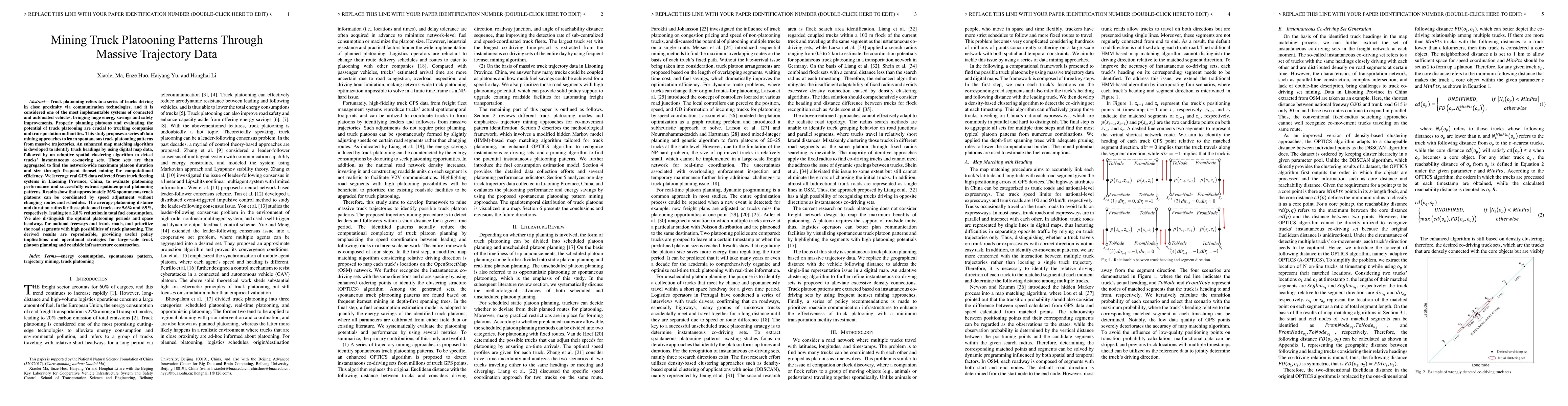 This study proposes a novel approach to learning spontaneous truck platooning patterns from massive trajectories using data mining techniques.