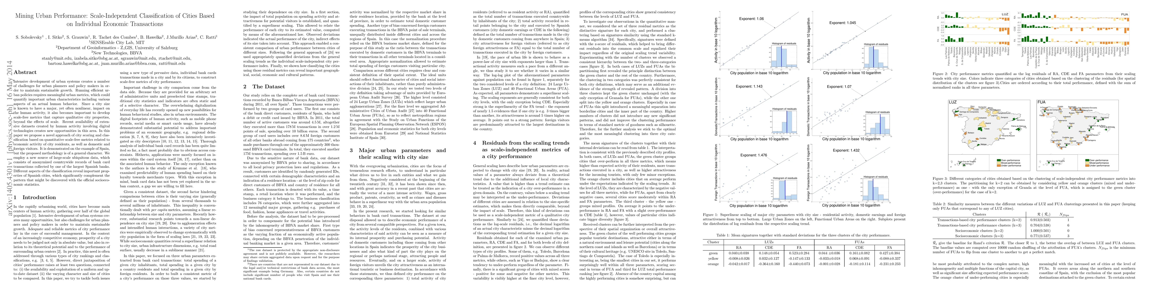 This paper proposes a novel approach to urban performance measurement using scale-independent classification based on economic transactions in Spanish cities, revealing new insights beyond official socioeconomic statistics.