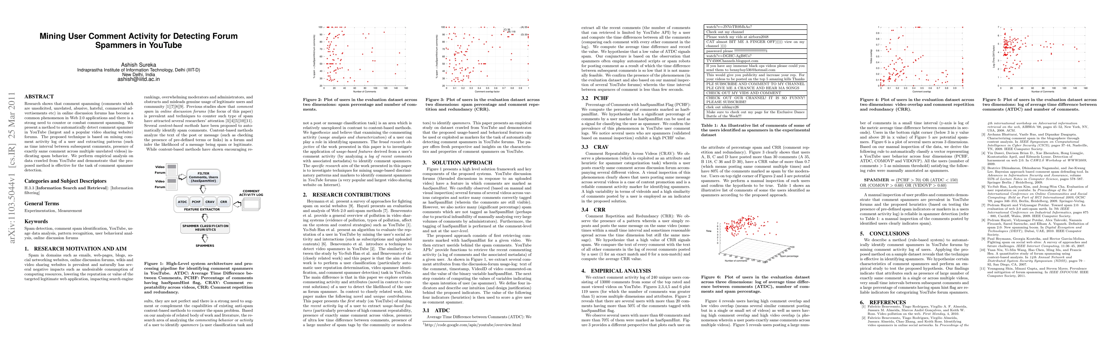 This research paper proposes a method to detect YouTube forum spammers by analyzing user comment activity patterns. The approach is effective in identifying spam behavior and has been demonstrated through empirical analysis on crawled data from YouTube.