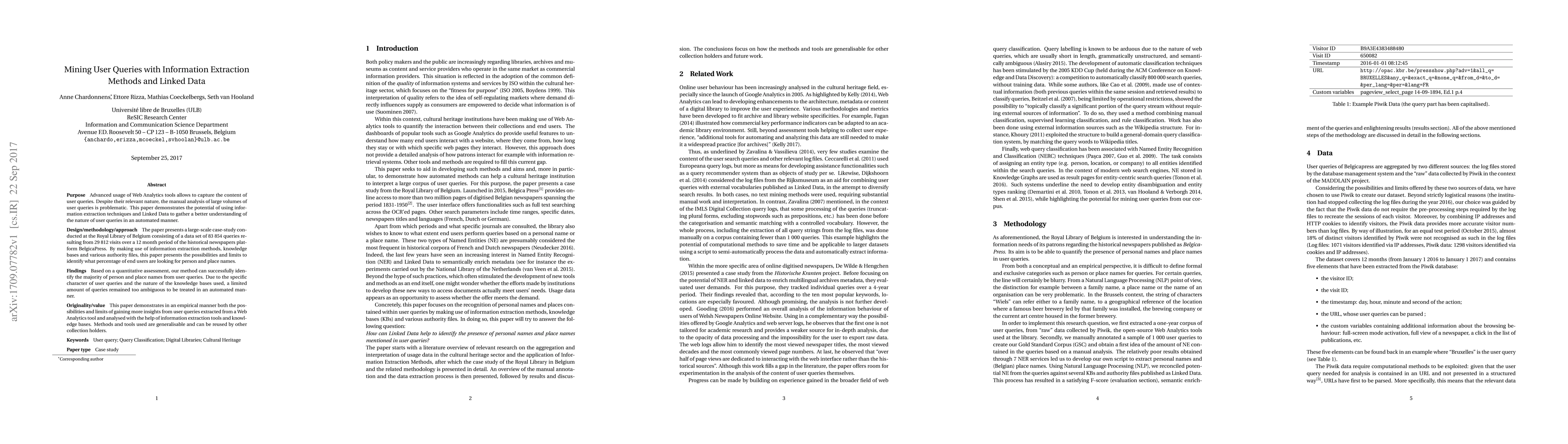 Purpose: Advanced usage of Web Analytics tools allows to capture the content of user queries. Despite their relevant nature, the manual analysis of large volumes of user queries is problematic. This paper demonstrates the potential of using information extraction techniques and Linked Data to gather a better understanding of the nature of user queries in an automated manner. Design/methodology/approach: The paper presents a large-scale case-study conducted at the Royal Library of Belgium consisting of a data set of 83 854 queries resulting from 29 812 visits over a 12 month period of the historical newspapers platform BelgicaPress. By making use of information extraction methods, knowledge bases and various authority files, this paper presents the possibilities and limits to identify what percentage of end users are looking for person and place names. Findings: Based on a quantitative assessment, our method can successfully identify the majority of person and place names from user queries. Due to the specific character of user queries and the nature of the knowledge bases used, a limited amount of queries remained too ambiguous to be treated in an automated manner. Originality/value: This paper demonstrates in an empirical manner both the possibilities and limits of gaining more insights from user queries extracted from a Web Analytics tool and analysed with the help of information extraction tools and knowledge bases. Methods and tools used are generalisable and can be reused by other collection holders.