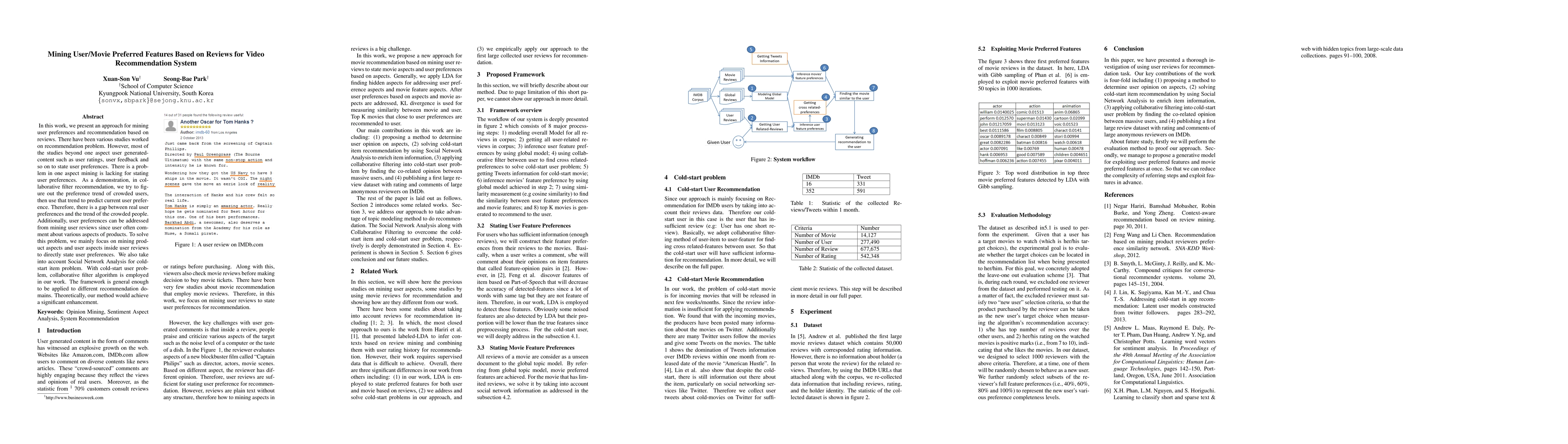 This paper proposes a method to enhance video recommendation systems by mining user preferences from reviews, focusing on product and user aspects to bridge the gap between crowd-based trends and actual user preferences. It also addresses the cold-start problem using Social Network Analysis and collaborative filtering.