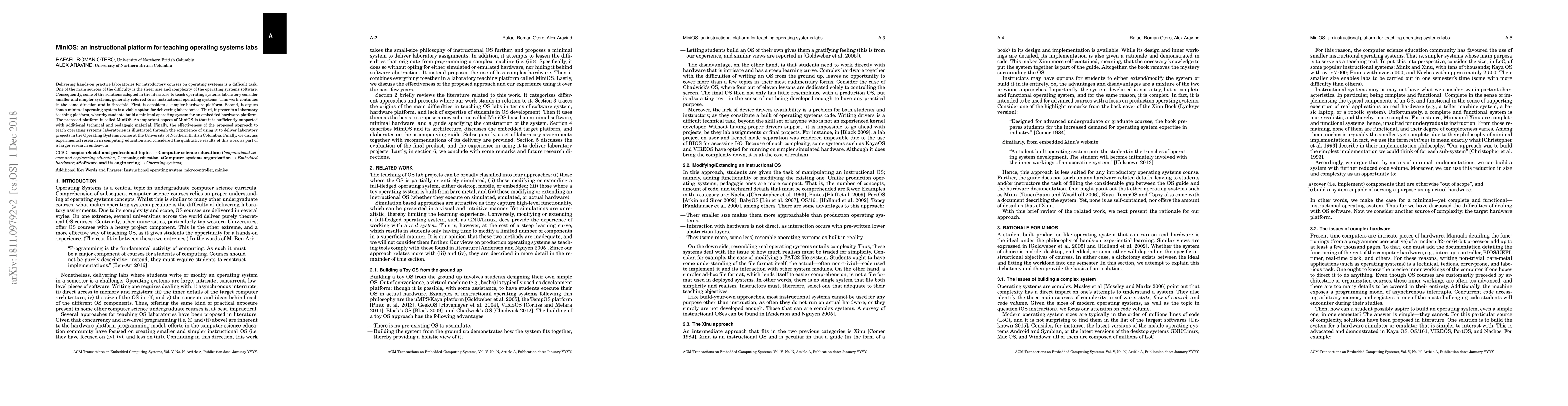 MiniOS is an instructional platform for teaching operating systems labs using a simplified hardware platform and minimal operating system, which effectively delivers hands-on practice to introductory courses. The approach has been tested in university settings with promising results.