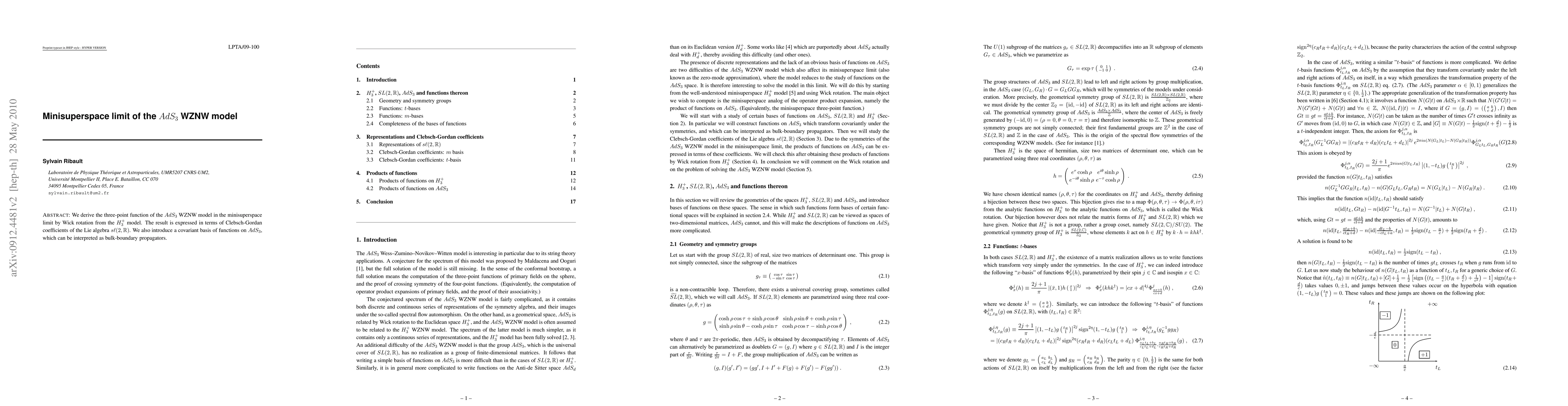 We derive the three-point function of the AdS3 WZNW model in the minisuperspace limit by Wick rotation from the H3+ model. The result is expressed in terms of Clebsch-Gordan coefficients of the Lie algebra sl(2,R). We also introduce a covariant basis of functions on AdS3, which can be interpreted as bulk-boundary propagators.