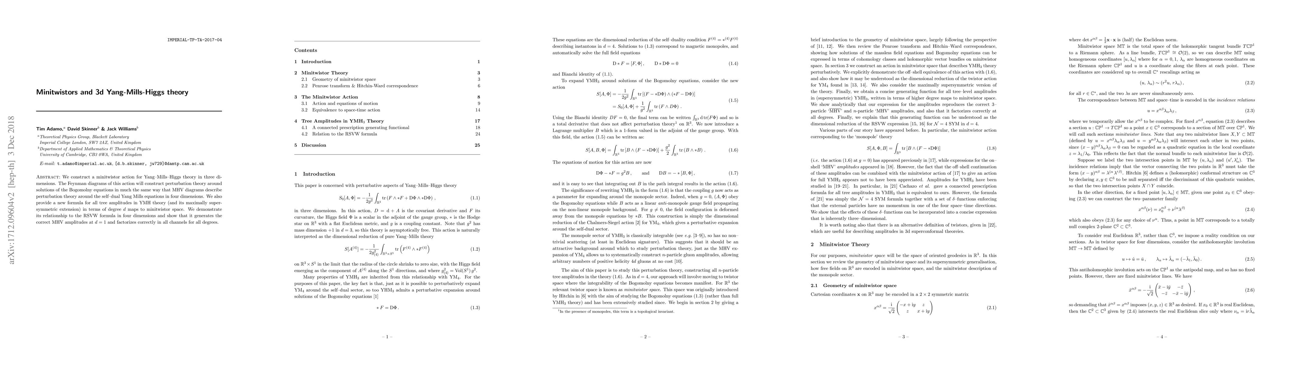 We construct a minitwistor action for Yang--Mills--Higgs theory in three dimensions. The Feynman diagrams of this action will construct perturbation theory around solutions of the Bogomolny equations in much the same way that MHV diagrams describe perturbation theory around the self--dual Yang Mills equations in four dimensions. We also provide a new formula for all tree amplitudes in YMH theory (and its maximally supersymmetric extension) in terms of degree d maps to minitwistor space. We demonstrate its relationship to the RSVW formula in four dimensions and show that it generates the correct MHV amplitudes at d=1 and factorizes correctly in all channels for all degrees.