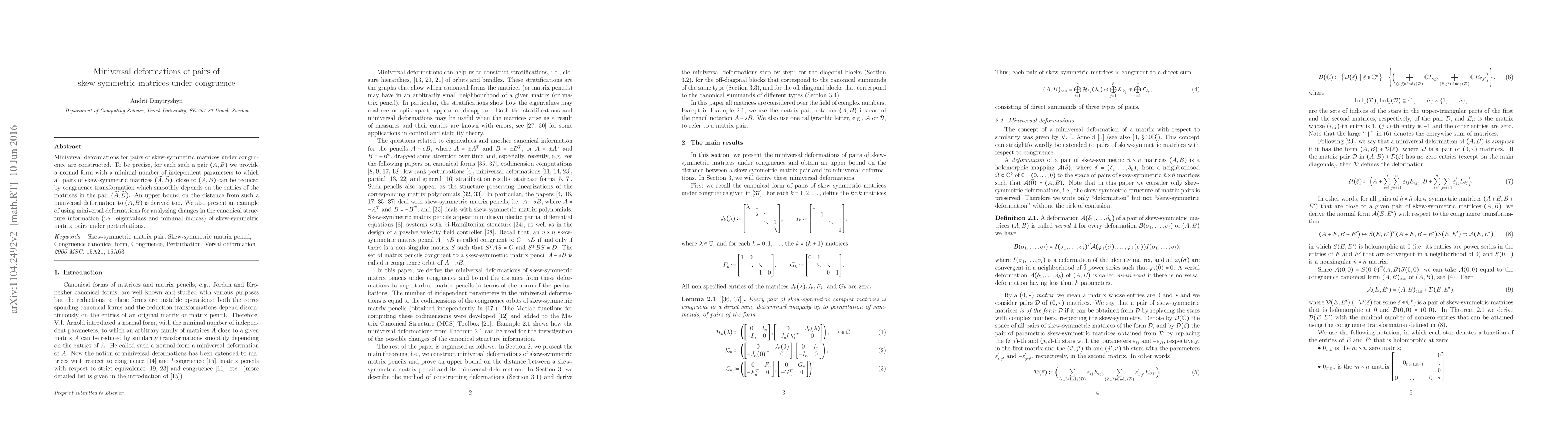 This paper constructs miniversal deformations for pairs of skew-symmetric matrices under congruence, providing a normal form with minimal parameters to which nearby pairs can be transformed. An upper bound on the distance from the deformation to the original pair is also derived, and an example is given to illustrate the analysis of changes in canonical structure information under perturbations.