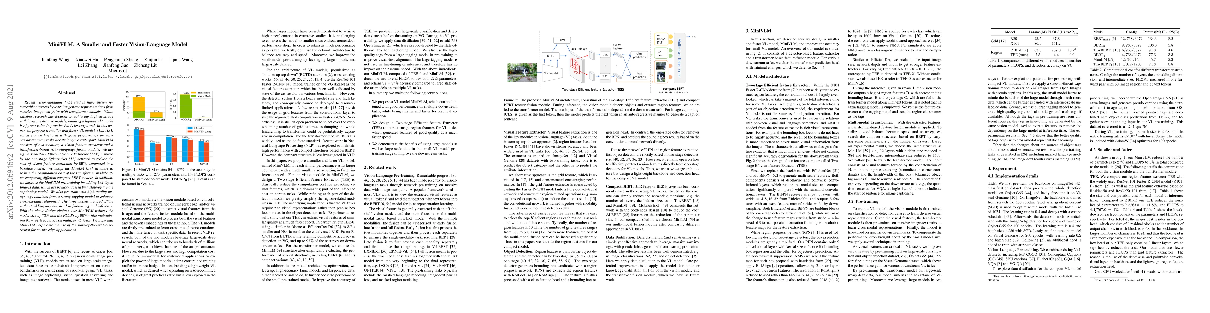 MiniVLM is a compact vision-language model designed to be smaller and faster than existing large models, achieving significant reductions in size and inference time while maintaining high accuracy on various tasks. It employs an efficient feature extractor and a MiniLM-based transformer module, pre-trained with additional data to enhance performance.