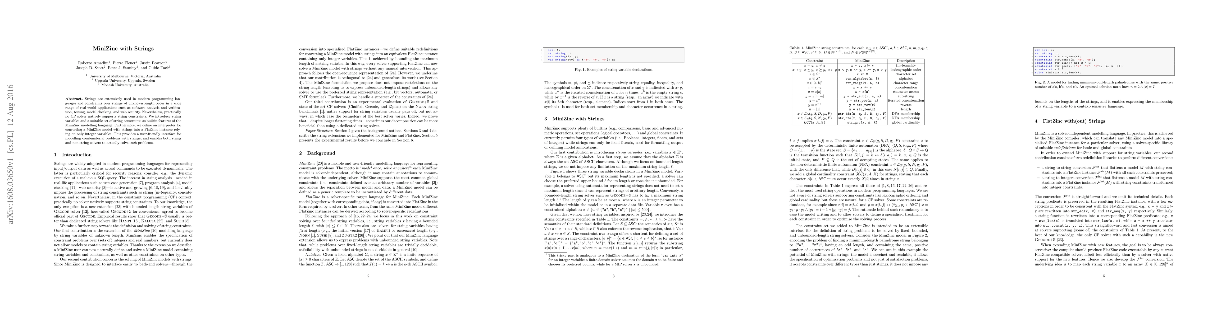Strings are extensively used in modern programming languages and constraints over strings of unknown length occur in a wide range of real-world applications such as software analysis and verification, testing, model checking, and web security. Nevertheless, practically no CP solver natively supports string constraints. We introduce string variables and a suitable set of string constraints as builtin features of the MiniZinc modelling language. Furthermore, we define an interpreter for converting a MiniZinc model with strings into a FlatZinc instance relying on only integer variables. This provides a user-friendly interface for modelling combinatorial problems with strings, and enables both string and non-string solvers to actually solve such problems.