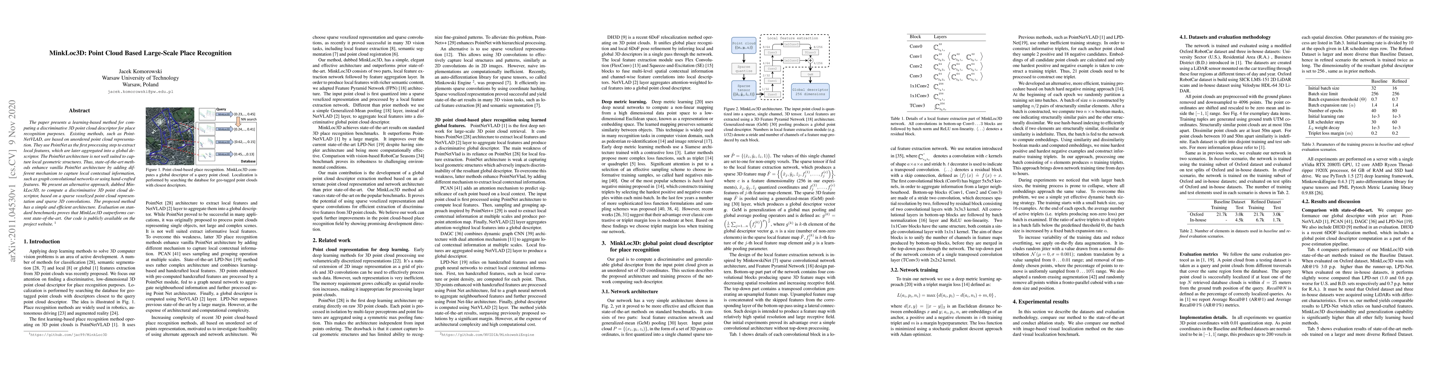 The paper introduces MinkLoc3D, a novel method for large-scale 3D place recognition using discriminative point cloud descriptors based on sparse voxelization and convolutions, outperforming existing state-of-the-art techniques. The method's efficiency and simplicity are demonstrated through benchmark evaluations.