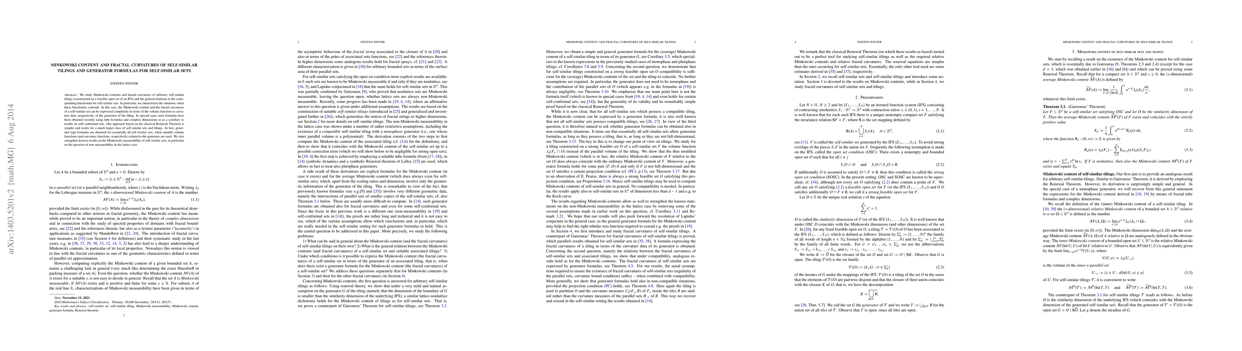 This paper investigates Minkowski contents and fractal curvatures of self-similar tilings and sets, deriving generator formulas for their properties using the Renewal Theorem. It shows these properties can be expressed through the generator's volume and curvature data, and addresses the measurability of self-similar sets.