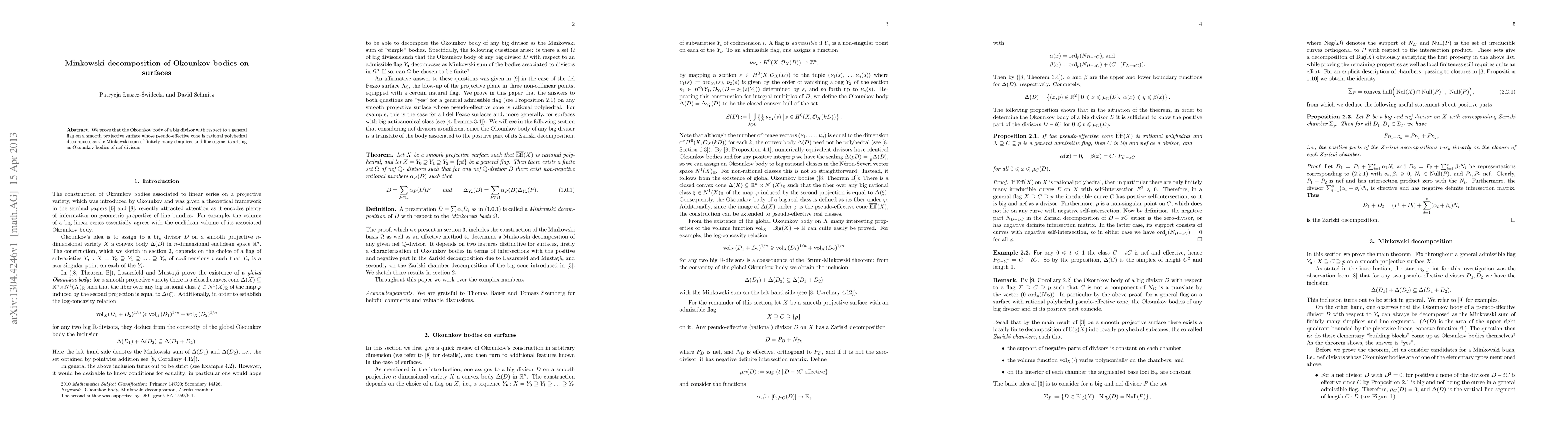 This paper proves that the Okounkov body of a big divisor on a smooth projective surface with a rational polyhedral pseudo-effective cone decomposes as the Minkowski sum of finitely many simplices and line segments, which correspond to Okounkov bodies of nef divisors. This decomposition provides insight into the structure of Okounkov bodies on surfaces.