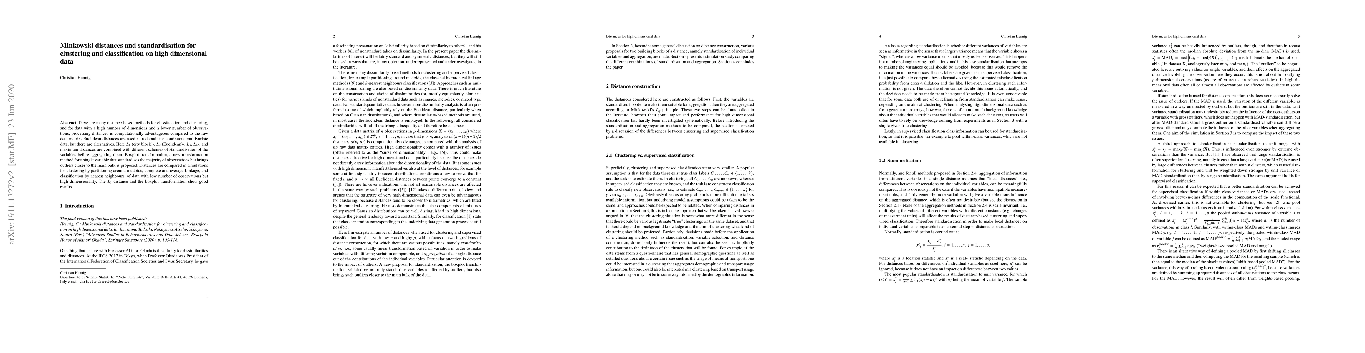 There are many distance-based methods for classification and clustering, and for data with a high number of dimensions and a lower number of observations, processing distances is computationally advantageous compared to the raw data matrix. Euclidean distances are used as a default for continuous multivariate data, but there are alternatives. Here the so-called Minkowski distances, $L_1$ (city block)-, $L_2$ (Euclidean)-, $L_3$-, $L_4$-, and maximum distances are combined with different schemes of standardisation of the variables before aggregating them. Boxplot transformation is proposed, a new transformation method for a single variable that standardises the majority of observations but brings outliers closer to the main bulk of the data. Distances are compared in simulations for clustering by partitioning around medoids, complete and average linkage, and classification by nearest neighbours, of data with a low number of observations but high dimensionality. The $L_1$-distance and the boxplot transformation show good results.