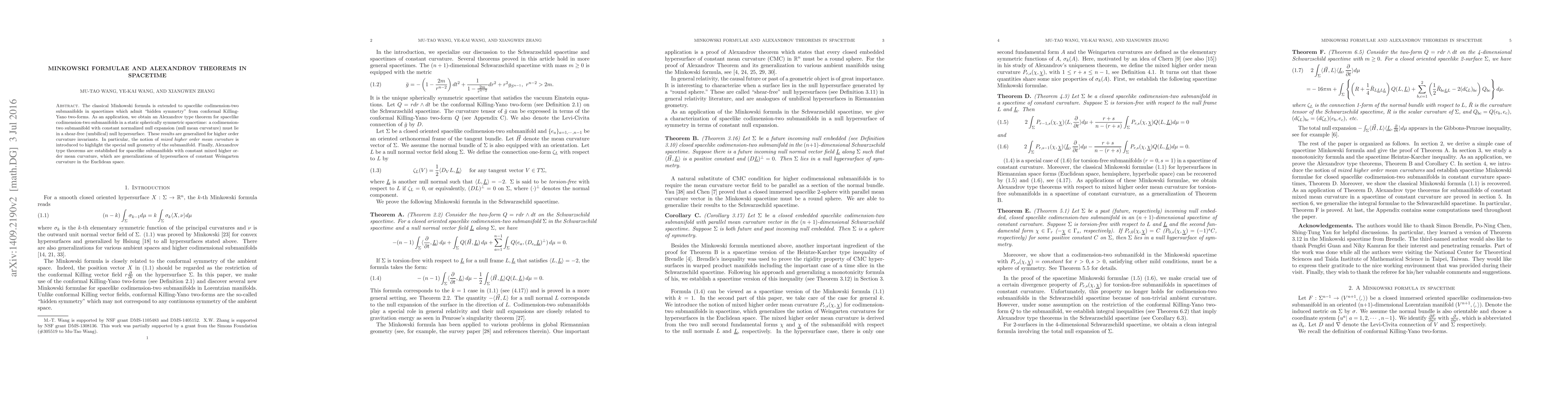 This paper extends the Minkowski formula to spacelike codimension-two submanifolds in spacetimes with conformal Killing-Yano two-forms, leading to Alexandrov theorems for such submanifolds in static spherically symmetric spacetimes. It also introduces mixed higher order mean curvature and generalizes Alexandrov theorems for submanifolds with constant mixed higher order mean curvature.