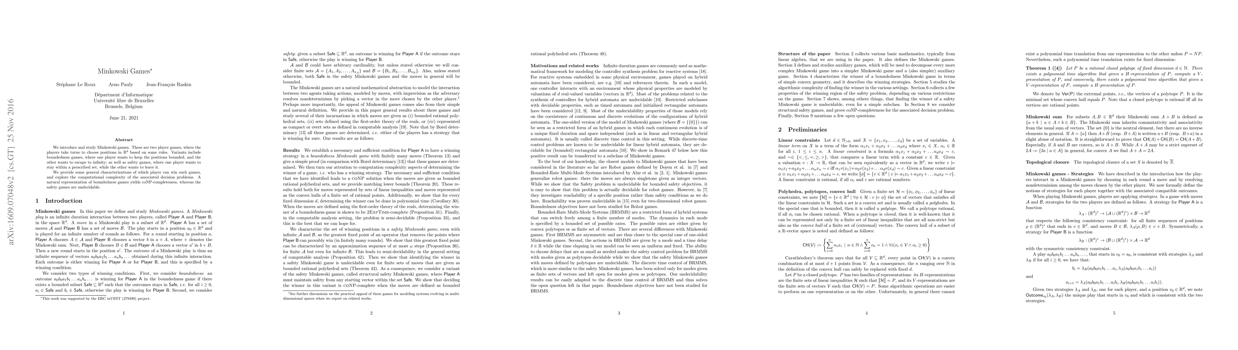 Minkowski games involve two players selecting positions in $\mathbb{R}^d$ with rules that vary between boundedness and safety games. The paper characterizes winning strategies and determines the computational complexity, with boundedness games being coNP-complete and safety games undecidable.