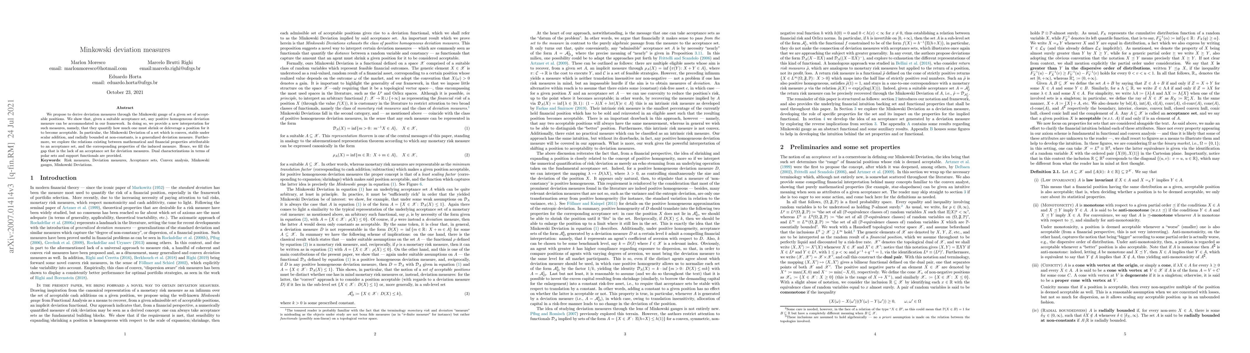 We propose to derive deviation measures through the Minkowski gauge of a given set of acceptable positions. We show that, given a suitable acceptance set, any positive homogeneous deviation measure can be accommodated in our framework. In doing so, we provide a new interpretation for such measures, namely, that they quantify how much one must shrink or deleverage a position for it to become acceptable. In particular, the Minkowski Deviation of a set which is convex, stable under scalar addition, and radially bounded at non-constants, is a generalized deviation measure. Furthermore, we explore the relations existing between mathematical and financial properties attributable to an acceptance set, and the corresponding properties of the induced measure. Hence, we fill the gap that is the lack of an acceptance set for deviation measures. Dual characterizations in terms of polar sets and support functionals are provided.