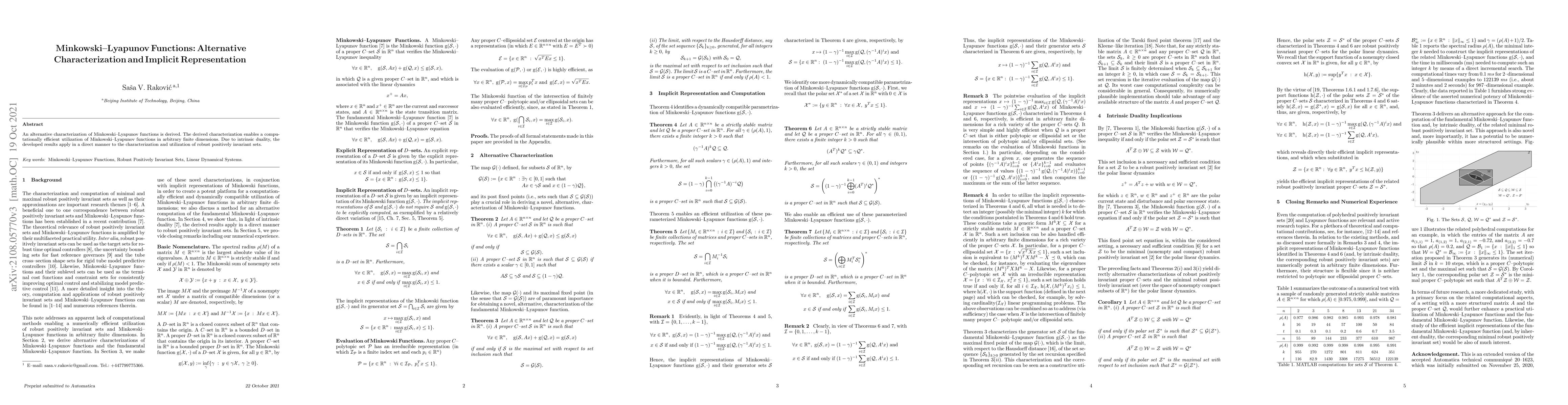 An alternative characterization of Minkowski--Lyapunov functions is derived. The derived characterization enables a computationally efficient utilization of Minkowski--Lyapunov functions in arbitrary finite dimensions. Due to intrinsic duality, the developed results apply in a direct manner to the characterization and utilization of robust positively invariant sets.