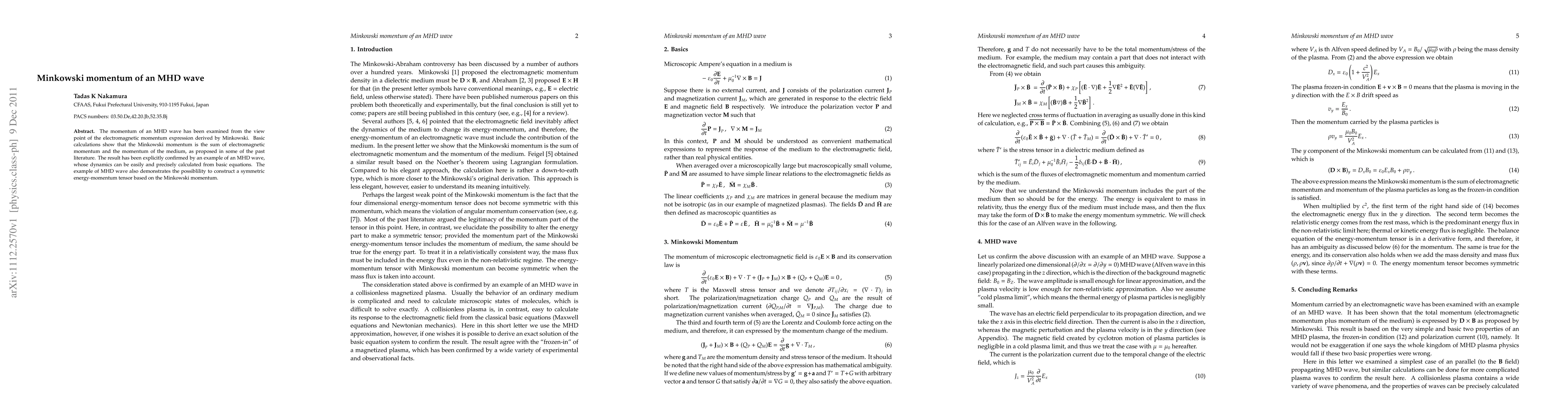 This paper examines the Minkowski momentum of an MHD wave, confirming that it is the sum of electromagnetic momentum and medium momentum. An example MHD wave demonstrates the construction of a symmetric energy-momentum tensor based on this concept.