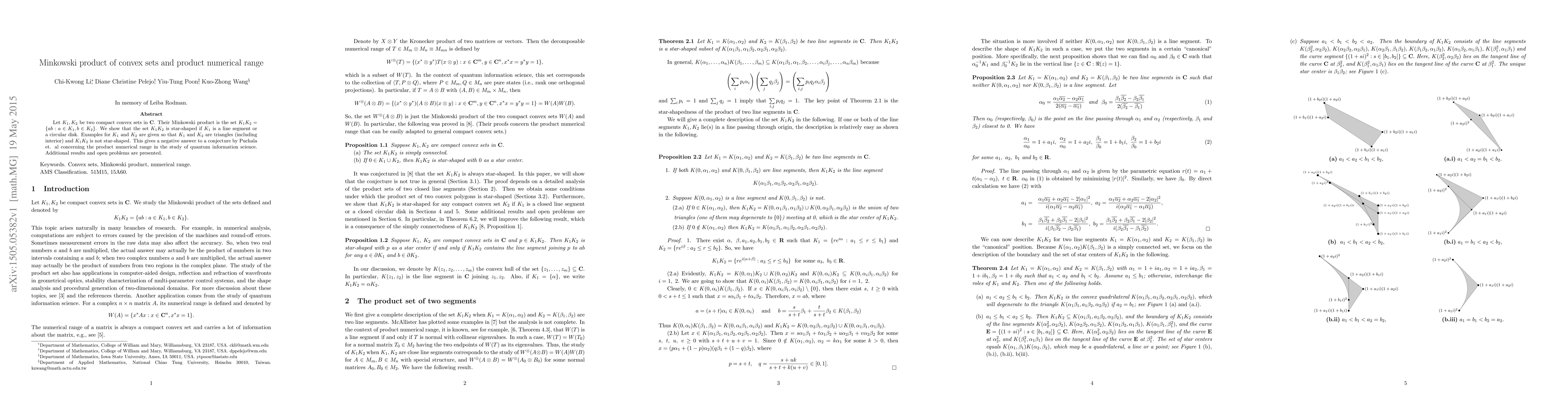 Let $K_1, K_2$ be two compact convex sets in $\mathit{C}$. Their Minkowski product is the set $K_1K_2 = \{ab: a \in K_1, b\in K_2\}$. We show that the set $K_1K_2$ is star-shaped if $K_1$ is a line segment or a circular disk. Examples for $K_1$ and $K_2$ are given so that $K_1$ and $K_2$ are triangles (including interior) and $K_1K_2$ is not star-shaped. This gives a negative answer to a conjecture by Puchala et. al concerning the product numerical range in the study of quantum information science. Additional results and open problems are presented.