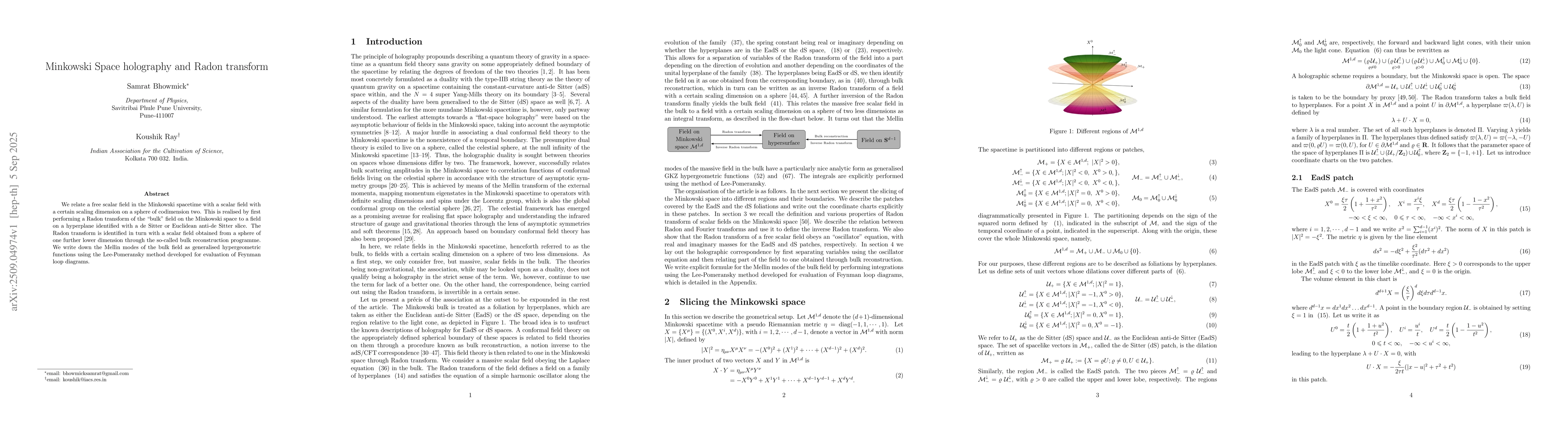 We relate a free scalar field in the Minkowski spacetime with a scalar field with a certain scaling dimension on a sphere of codimension two. This is realised by first performing a Radon transform of the ``bulk" field on the Minkowski space to a field on a hyperplane identified with a de Sitter or Euclidean anti-de Sitter slice. The Radon transform is identified in turn with a scalar field obtained from a sphere of one further lower dimension through the so-called bulk reconstruction programme. We write down the Mellin modes of the bulk field as generalised hypergeometric functions using the Lee-Pomeransky method developed for evaluation of Feynman loop diagrams.