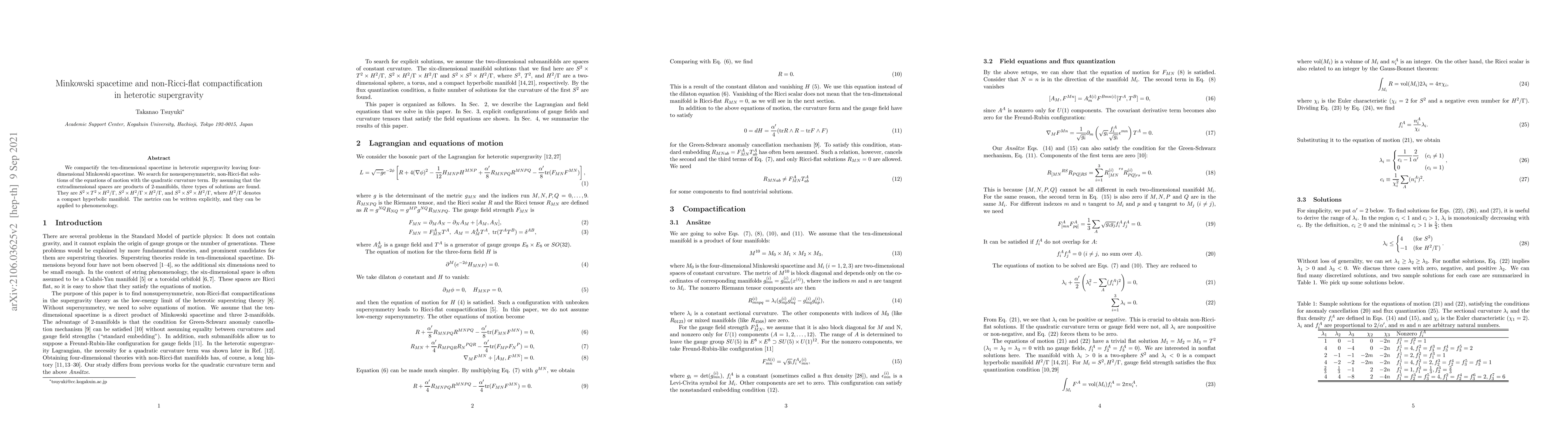 We compactify the ten-dimensional spacetime in heterotic supergravity leaving four-dimensional Minkowski spacetime. We search for nonsupersymmetric, non-Ricci-flat solutions of the equations of motion with the quadratic curvature term. By assuming that the extradimensional spaces are products of 2-manifolds, three types of solutions are found. They are $S^2\times T^2 \times H^2/\Gamma$, $S^2\times H^2/\Gamma \times H^2/\Gamma$, and $S^2\times S^2 \times H^2/\Gamma$, where $H^2/\Gamma$ denotes a compact hyperbolic manifold. The metrics can be written explicitly, and they can be applied to phenomenology.