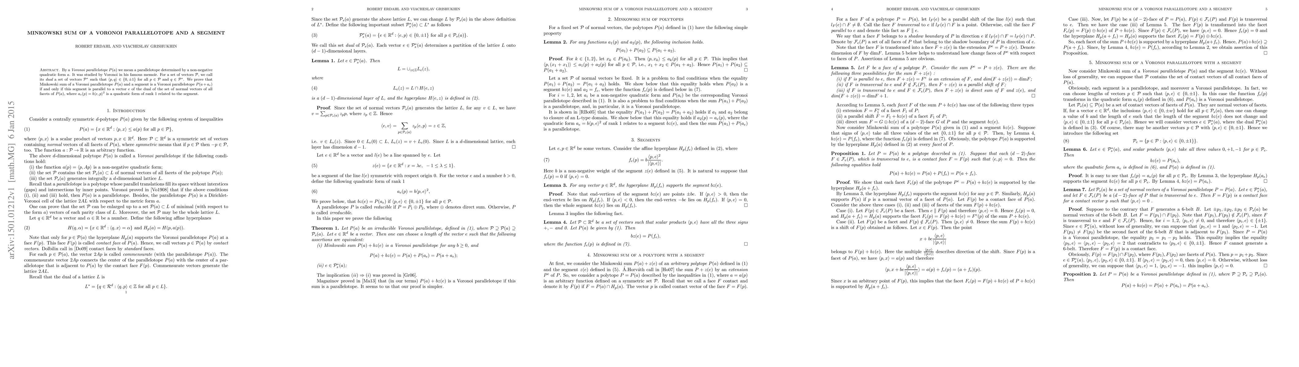 By a {\em Voronoi parallelotope} $P(a)$ we mean a parallelotope determined by a non-negative quadratic form $a$. It was studied by Voronoi in his famous memoir. For a set of vectors $\mathcal P$, we call its {\em dual} a set of vectors ${\mathcal P}^*$ such that $\langle p,q\rangle\in\{0,\pm 1\}$ for all $p\in{\mathcal P}$ and $q\in{\mathcal P}^*$. We prove that Minkowski sum of a Voronoi parallelotope $P(a)$ and a segment is a Voronoi parallelotope $P(a+a_e)$ if and only if this segment is parallel to a vector $e$ of the dual of the set of normal vectors of all facets of $P(a)$, where $a_e(p)=b\langle e,p\rangle^2$ is a quadratic form of rank 1 related to the segment.