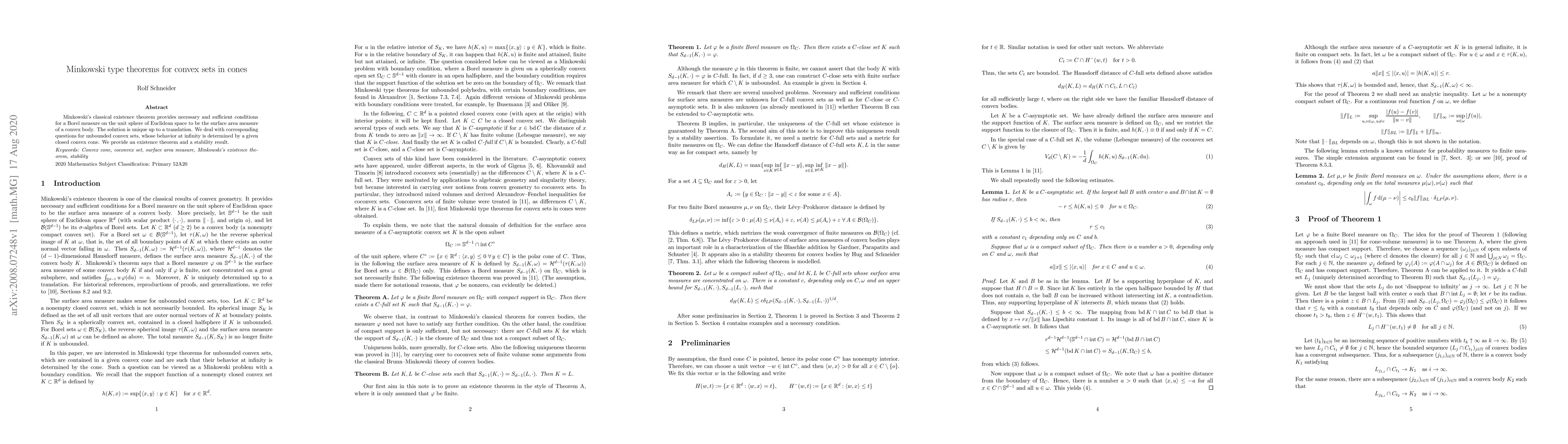 This paper extends Minkowski's classical theorem to unbounded convex sets shaped by cones, establishing conditions for their surface measures and demonstrating their stability. These results help understand the geometry of large, unbounded shapes in higher-dimensional spaces.
