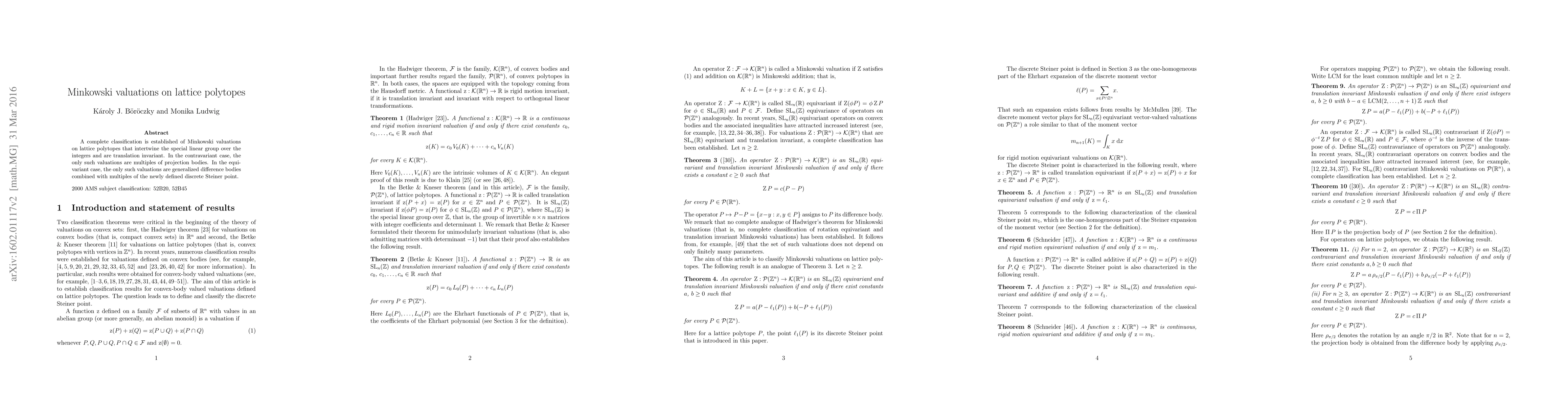A complete classification is established of Minkowski valuations on lattice polytopes that intertwine the special linear group over the integers and are translation invariant. In the contravariant case, the only such valuations are multiples of projection bodies. In the equivariant case, the only such valuations are generalized difference bodies combined with multiples of the newly defined discrete Steiner point.