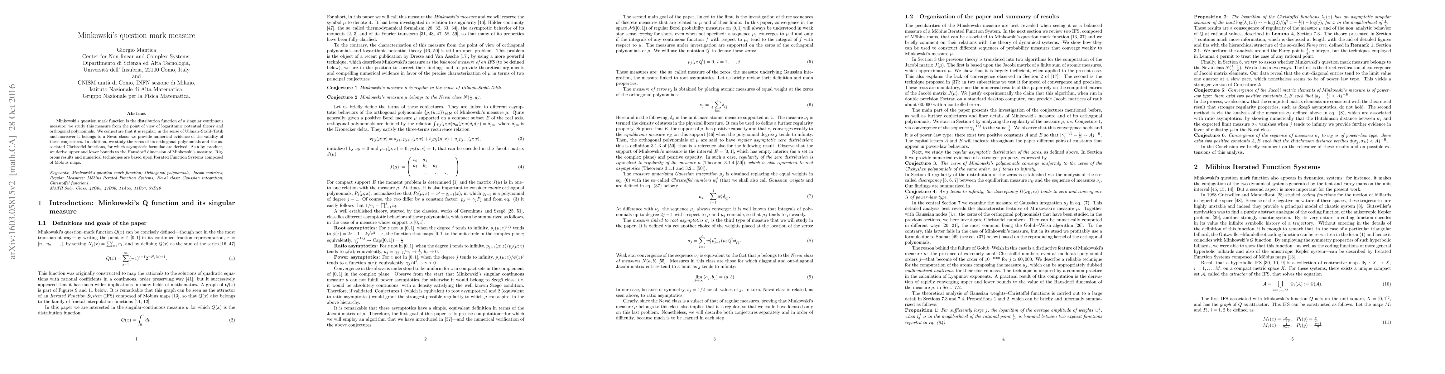 Minkowski's question mark function is the distribution function of a singular continuous measure: we study this measure from the point of view of logarithmic potential theory and orthogonal polynomials. We conjecture that it is regular, in the sense of Ullman--Stahl--Totik and moreover it belongs to a Nevai class: we provide numerical evidence of the validity of these conjectures. In addition, we study the zeros of its orthogonal polynomials and the associated Christoffel functions, for which asymptotic formulae are derived. Rigorous results and numerical techniques are based upon Iterated Function Systems composed of Mobius maps.