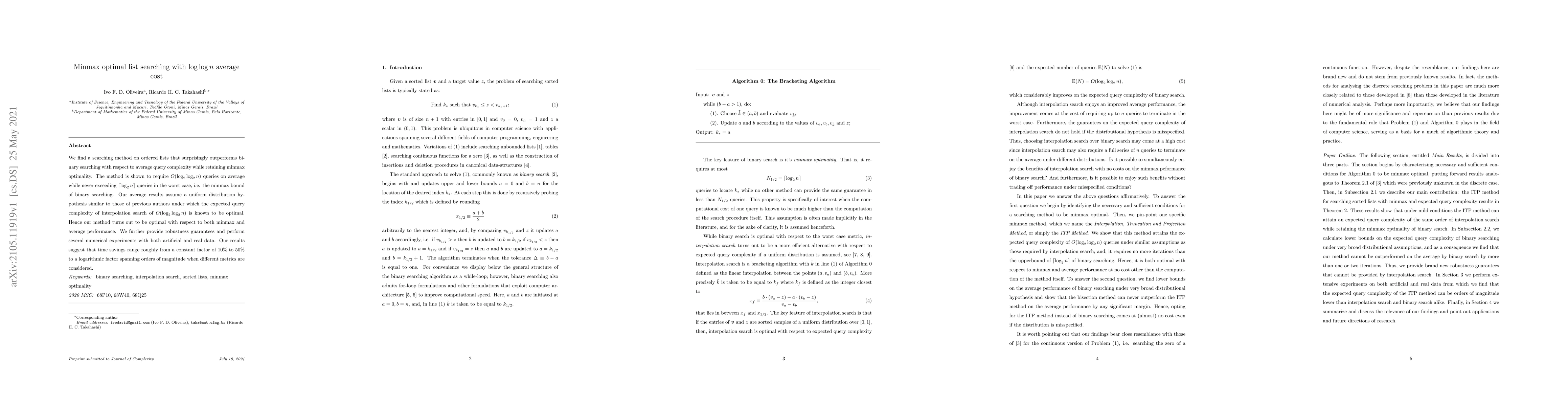 We find a searching method on ordered lists that surprisingly outperforms binary searching with respect to average query complexity while retaining minmax optimality. The method is shown to require $O(\log_2\log_2 n)$ queries on average while never exceeding $\lceil \log_2 n \rceil$ queries in the worst case, i.e. the minmax bound of binary searching. Our average results assume a uniform distribution hypothesis similar to those of prevous authors under which the expected query complexity of interpolation search of $O(\log_2\log_2 n)$ is known to be optimal. Hence our method turns out to be optimal with respect to both minmax and average performance. We further provide robustness guarantees and perform several numerical experiments with both artificial and real data. Our results suggest that time savings range roughly from a constant factor of 10\% to 50\% to a logarithmic factor spanning orders of magnitude when different metrics are considered.