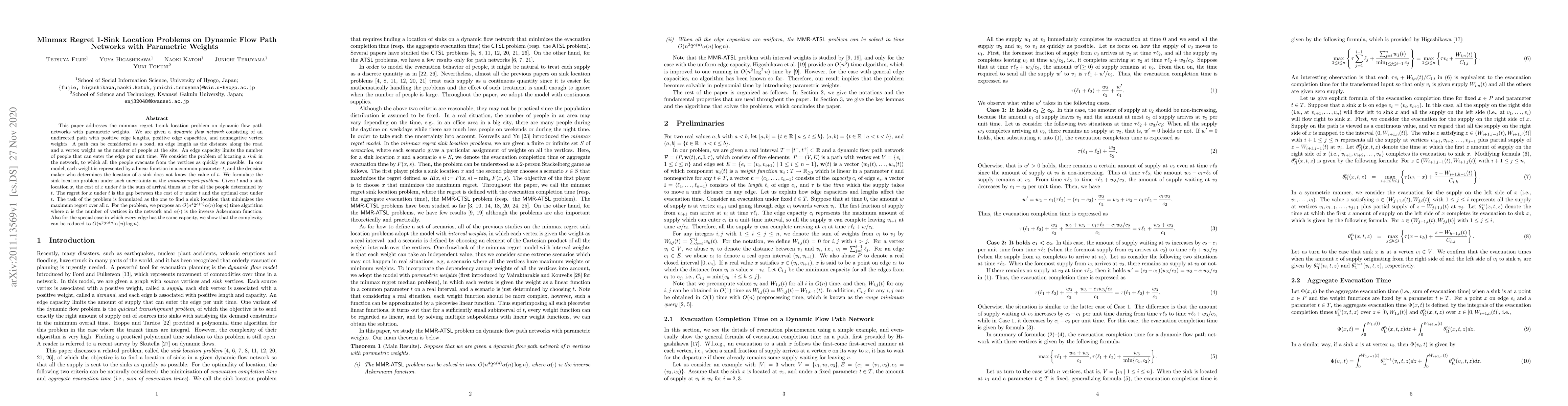 This paper tackles the minmax regret 1-sink location problem on dynamic flow path networks with parametric weights, proposing an algorithm to minimize the maximum regret when the exact parameter value is unknown. The problem involves evacuating people from vertices to a sink along a road network, with capacities and weights represented as linear functions of a parameter $t$.