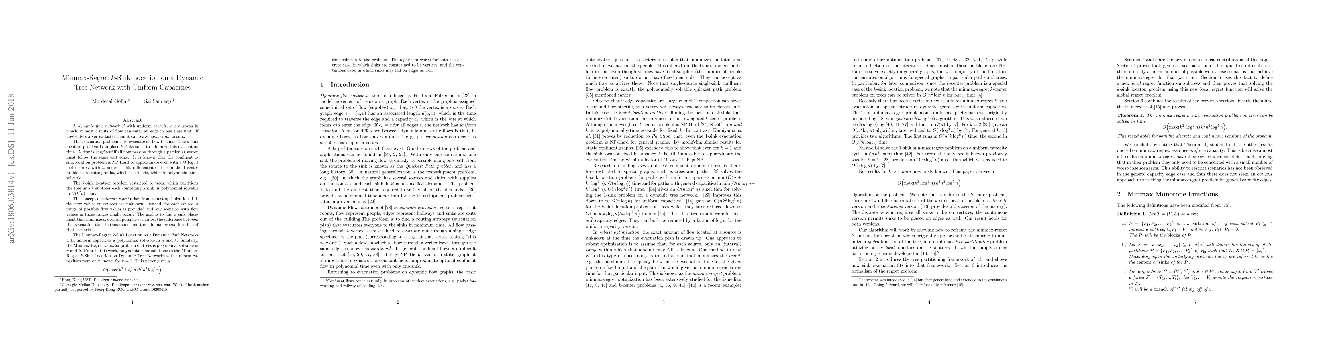 A dynamic flow network $G$ with uniform capacity $c$ is a graph in which at most $c$ units of flow can enter an edge in one time unit. If flow enters a vertex faster than it can leave, congestion occurs. The evacuation problem is to evacuate all flow to sinks assuming that all flow is confluent, i.e., all flow passing through a particular vertex must follow the same exit edge. The $k$-sink location problem is to place $k$-sinks so as to minimize this evacuation time. Although the $k$-sink location problem is NP-Hard on a general graph it can be solved in $\tilde O(k^2 n)$ time on trees. The concept of minmax-regret arises from robust optimization. For each source, a range of possible flow values is provided and any scenario with flow values in those ranges might occur. The goal is to find a sink placement that minimizes, over all possible scenarios, the difference between the evacuation time to those sinks and the minimal evacuation time of that scenario. The Minmax-Regret $k$-Sink Location on a Dynamic Path Networks with uniform capacities is polynomial solvable in $n$ and $k$. Similarly, the Minmax-Regret $k$-center problem on trees is polynomial solvable in $n$ and $k$. Prior to this work, polynomial time solutions to the Minmax-Regret $k$-Sink Location on Dynamic Tree Networks with uniform capacities were only known for $k=1$. This paper solves this problem, for general $k,$ in time $$O\Bigl( \max(k^2,\log ^2n)\, k^2 n^2 \log^5 n\Bigr).$$