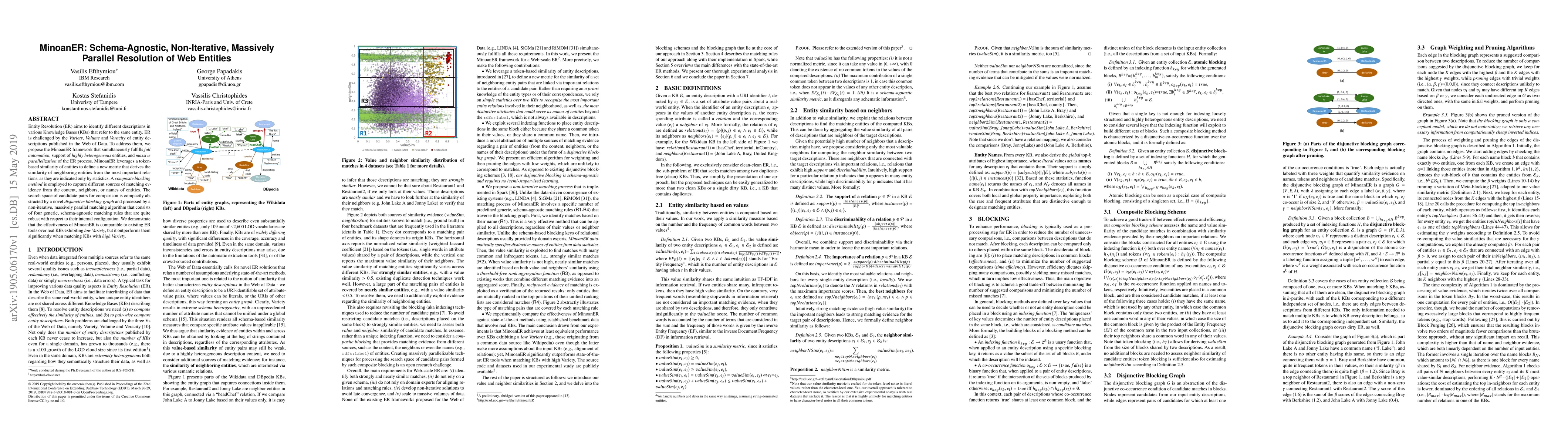 The MinoanER framework automates and massively parallelizes Entity Resolution (ER) by leveraging token-based similarity and a composite blocking method, outperforming existing tools in handling high-variety datasets. It employs a non-iterative, schema-agnostic algorithm with four generic matching rules.