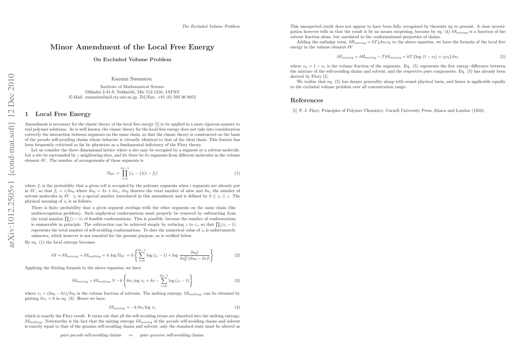 We make minor amendment for the theory of the local free energy which has been frequently criticized so far by physicists as a fundamental deficiency of the Flory theory.