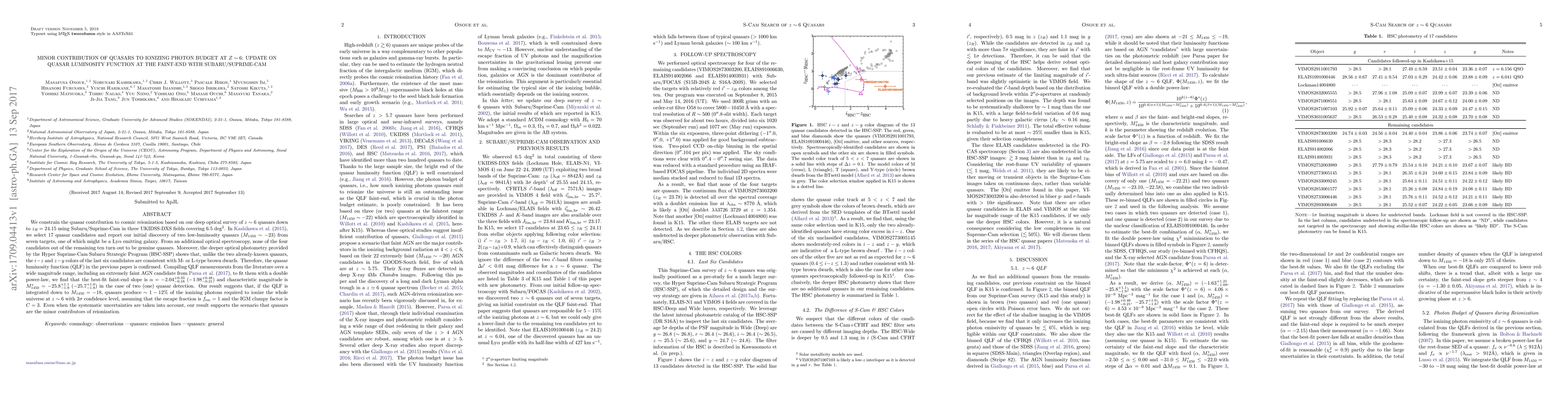 This study updates the quasar luminosity function (QLF) at faint magnitudes using Subaru/Suprime-Cam observations, confirming that quasars contribute only a minor portion (~1-12%) to the ionizing photon budget required for cosmic reionization at z~6. The analysis suggests quasars are not the primary drivers of reionization at this epoch.