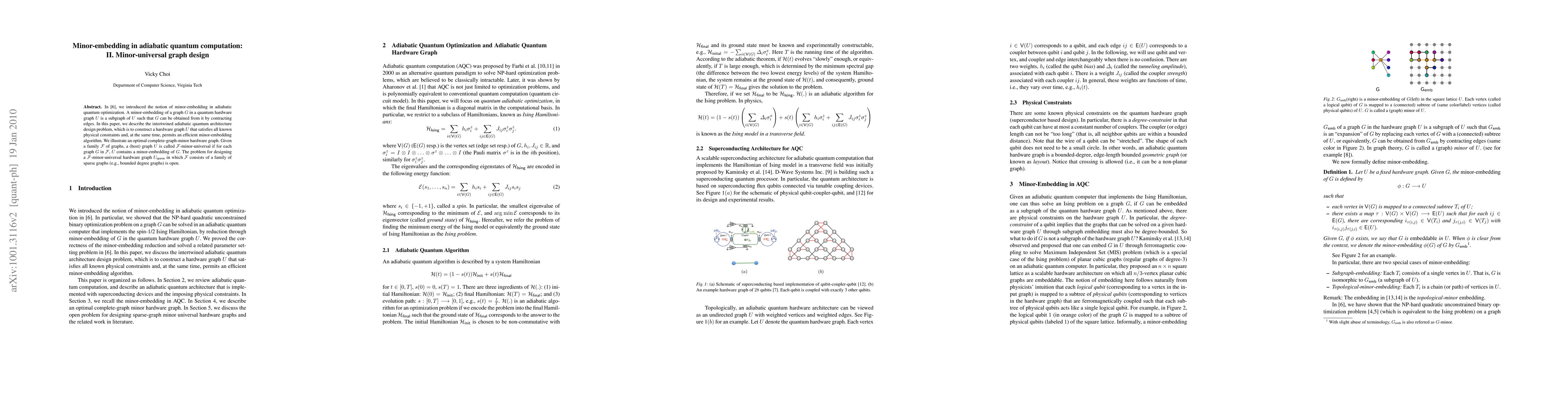 This paper explores the design of minor-universal graphs for efficient minor-embedding in adiabatic quantum computation, focusing on constructing sparse hardware graphs that can accommodate all graphs within a given family of sparse graphs. The paper proposes an optimal complete-graph-minor hardware graph and addresses the open problem of designing sparse, F-minor-universal graphs.