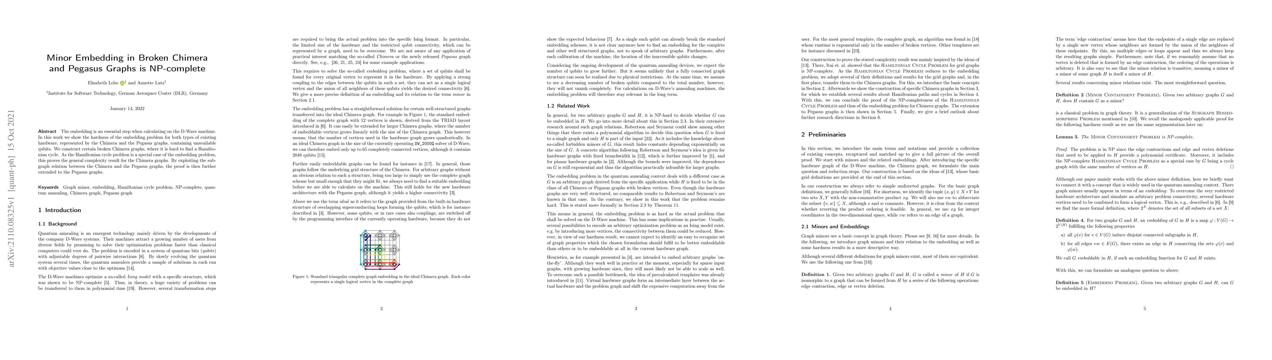 This paper demonstrates that minor embedding in broken Chimera and Pegasus graphs, which are used in D-Wave quantum machine calculations, is NP-complete. It proves the complexity by showing the difficulty in finding Hamiltonian cycles in these graphs, extending the complexity result from Chimera to Pegasus graphs.