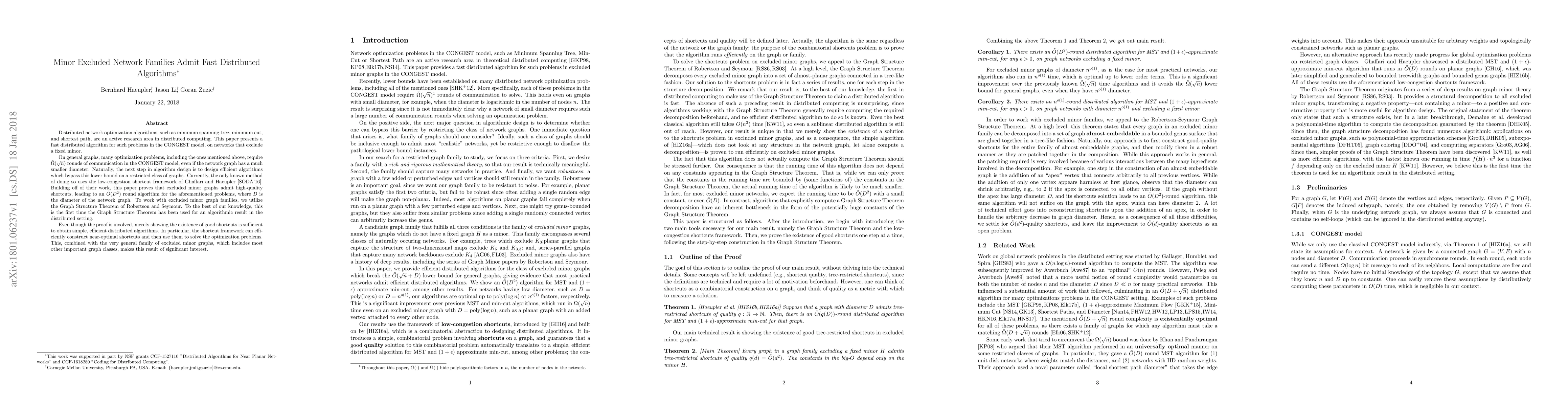 This paper presents fast distributed algorithms for network optimization problems, such as minimum spanning tree and shortest path, in the CONGEST model on networks excluding a fixed minor. It leverages the Graph Structure Theorem to construct high-quality shortcuts, achieving an efficient $\tilde O(D^2)$ round solution, where $D$ is the diameter, bypassing the $\tilde\Omega(\sqrt n)$ rounds typically required on general graphs.