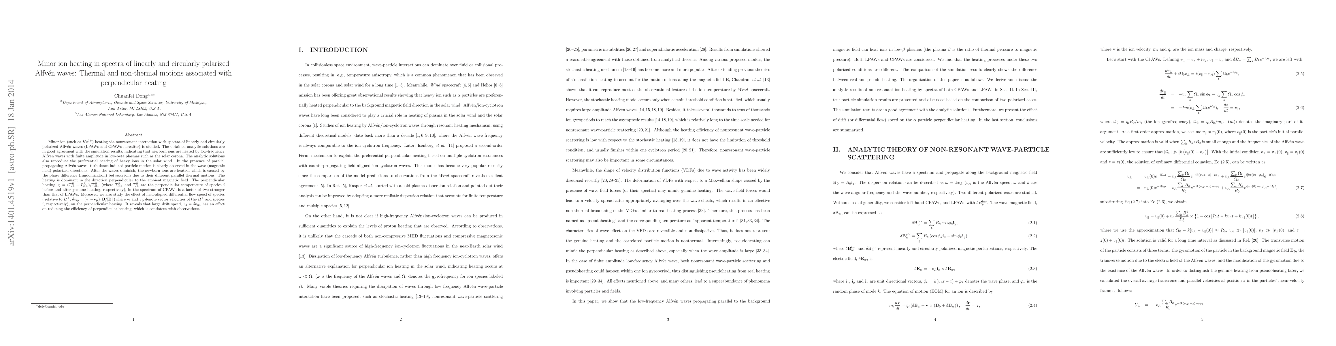 Minor ion (such as $He^{2+}$) heating via nonresonant interaction with spectra of linearly and circularly polarized Alfv\'{e}n waves (LPAWs and CPAWs hereafter) is studied. The obtained analytic solutions are in good agreement with the simulation results, indicating that newborn ions are heated by low-frequency Alfv\'{e}n waves with finite amplitude in low-beta plasmas such as the solar corona. The analytic solutions also reproduce the preferential heating of heavy ions in the solar wind. In the presence of parallel propagating Alfv\'{e}n waves, turbulence-induced particle motion is clearly observed in the wave (magnetic field) polarized directions. After the waves diminish, the newborn ions are heated, which is caused by the phase difference (randomization) between ions due to their different parallel thermal motions. The heating is dominant in the direction perpendicular to the ambient magnetic field. The perpendicular heating, $\eta=(T_{i\perp}^R-T_{i0\perp}^R)/T_{i0\perp}^R$ (where $T_{i0\perp}^R$ and $T_{i\perp}^R$ are the perpendicular temperature of species $i$ before and after genuine heating, respectively), in the spectrum of CPAWs is a factor of two stronger than that of LPAWs. Moreover, we also study the effect of field-aligned differential flow speed of species $i$ relative to $H^+$, $\delta v_{ip} = (\mathbf{v_i}-\mathbf{v_p}) \cdot \mathbf{B} / |\mathbf{B}|$ (where $\mathbf{v_i}$ and $\mathbf{v_p}$ denote vector velocities of the $H^+$ and species $i$, respectively), on the perpendicular heating. It reveals that large drift speed, $v_d=\delta v_{ip}$, has an effect on reducing the efficiency of perpendicular heating, which is consistent with observations.