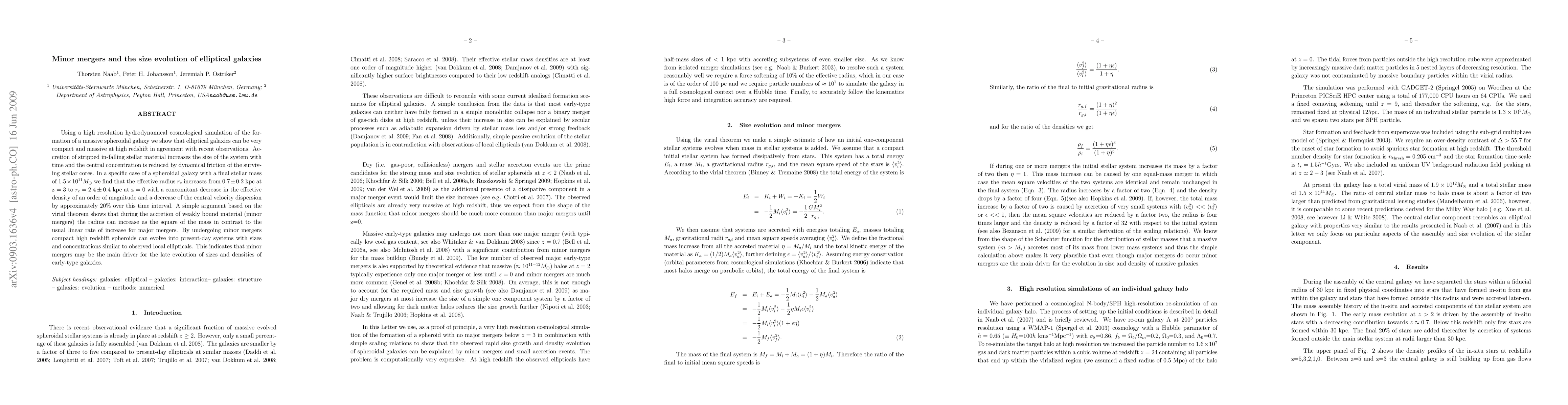 Using a high resolution hydrodynamical cosmological simulation of the formation of a massive spheroidal galaxy we show that elliptical galaxies can be very compact and massive at high redshift in agreement with recent observations. Accretion of stripped in-falling stellar material increases the size of the system with time and the central concentration is reduced by dynamical friction of the surviving stellar cores. In a specific case of a spheroidal galaxy with a final stellar mass of $1.5 \times 10^{11} M_{\odot}$ we find that the effective radius $r_e$ increases from $0.7 \pm 0.2 \rm kpc$ at z = 3 to $r_e = 2.4 \pm 0.4 \rm kpc$ at z = 0 with a concomitant decrease in the effective density of an order of magnitude and a decrease of the central velocity dispersion by approximately 20% over this time interval. A simple argument based on the virial theorem shows that during the accretion of weakly bound material (minor mergers) the radius can increase as the square of the mass in contrast to the usual linear rate of increase for major mergers. By undergoing minor mergers compact high redshift spheroids can evolve into present-day systems with sizes and concentrations similar to observed local ellipticals. This indicates that minor mergers may be the main driver for the late evolution of sizes and densities of early-type galaxies.