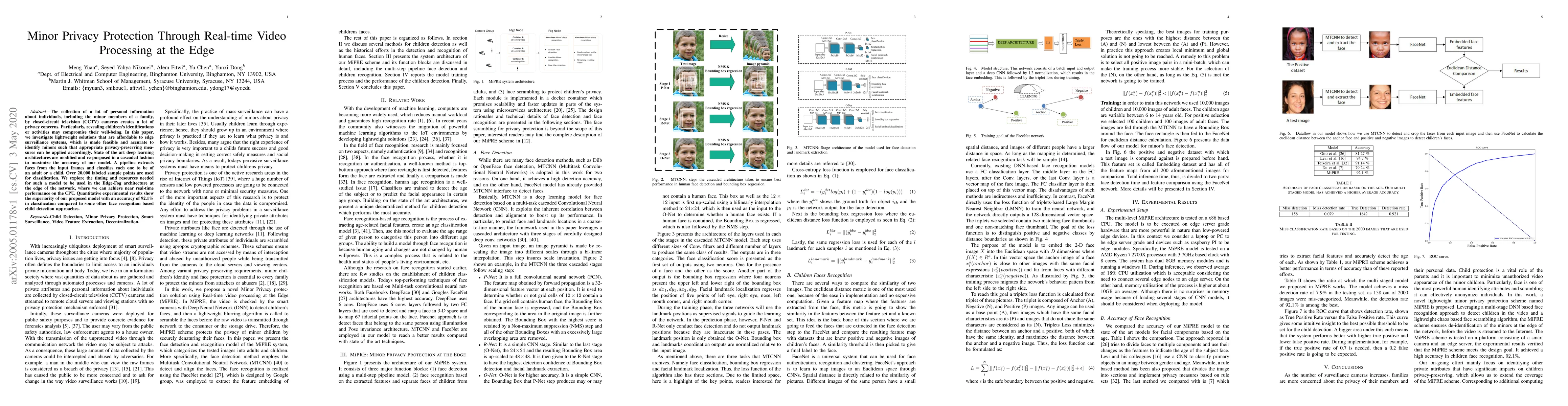 The collection of a lot of personal information about individuals, including the minor members of a family, by closed-circuit television (CCTV) cameras creates a lot of privacy concerns. Particularly, revealing children's identifications or activities may compromise their well-being. In this paper, we investigate lightweight solutions that are affordable to edge surveillance systems, which is made feasible and accurate to identify minors such that appropriate privacy-preserving measures can be applied accordingly. State of the art deep learning architectures are modified and re-purposed in a cascaded fashion to maximize the accuracy of our model. A pipeline extracts faces from the input frames and classifies each one to be of an adult or a child. Over 20,000 labeled sample points are used for classification. We explore the timing and resources needed for such a model to be used in the Edge-Fog architecture at the edge of the network, where we can achieve near real-time performance on the CPU. Quantitative experimental results show the superiority of our proposed model with an accuracy of 92.1% in classification compared to some other face recognition based child detection approaches.
