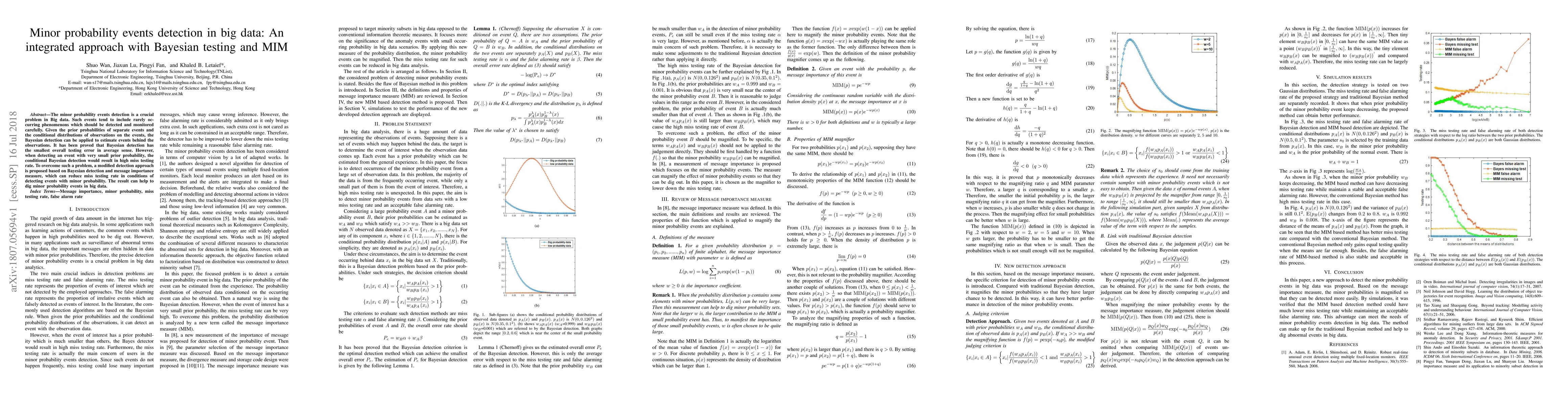 This paper proposes a modified detection approach combining Bayesian testing and message importance measure (MIM) to effectively identify minor probability events in big data. While Bayesian detection minimizes overall testing error, it struggles with low prior probability events, leading to high miss rates, which the new method aims to reduce.