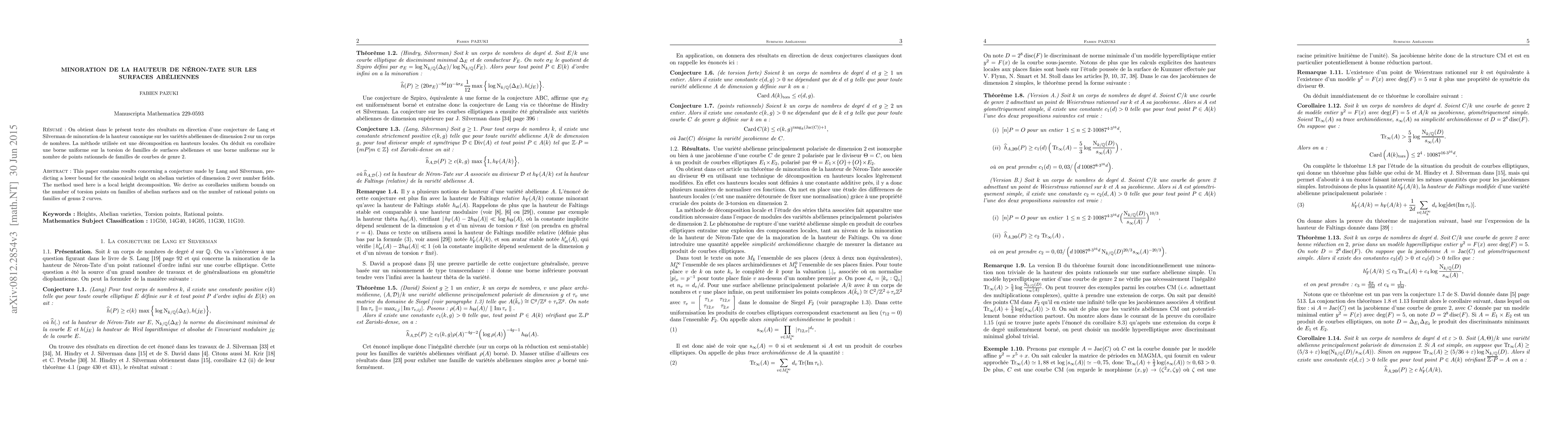 This paper contains results concerning a conjecture made by Lang and Silverman predicting a lower bound for the canonical height on abelian varieties of dimension 2 over number fields. The method used here is a local height decomposition. We derive as corollaries uniform bounds on the number of torsion points on families of abelian surfaces and on the number of rational points on families of genus 2 curves.