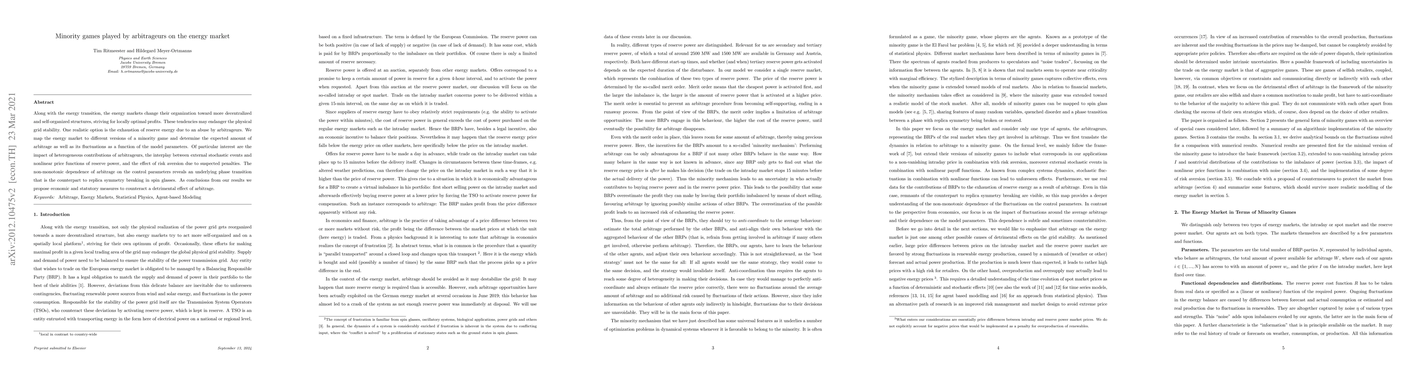 Along with the energy transition, the energy markets change their organization toward more decentralized and self-organized structures, striving for locally optimal profits. These tendencies may endanger the physical grid stability. One realistic option is the exhaustion of reserve energy due to an abuse by arbitrageurs. We map the energy market to different versions of a minority game and determine the expected amount of arbitrage as well as its fluctuations as a function of the model parameters. Of particular interest are the impact of heterogeneous contributions of arbitrageurs, the interplay between external stochastic events and nonlinear price functions of reserve power, and the effect of risk aversion due to suspected penalties. The non-monotonic dependence of arbitrage on the control parameters reveals an underlying phase transition that is the counterpart to replica symmetry breaking in spin glasses. As conclusions from our results we propose economic and statutory measures to counteract a detrimental effect of arbitrage.